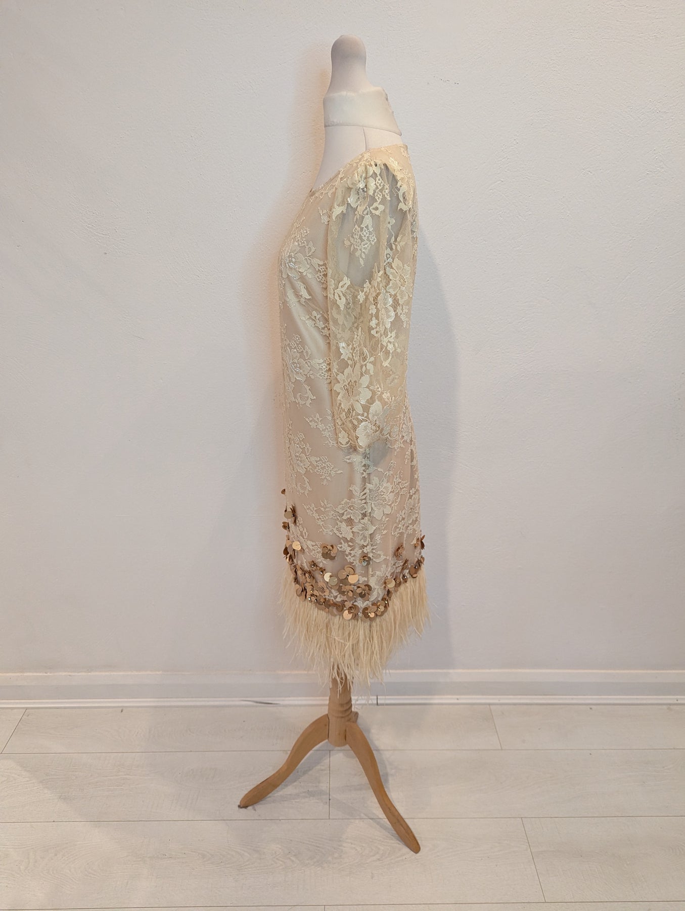 Condition: Excellent preloved condition no signs of wear. This stunning dress with lace overlay is embellished with sequins in 3d floral design around the bottom. A feather trim adds to the glamour. Perfect for the races, a winter wedding or a glam night out