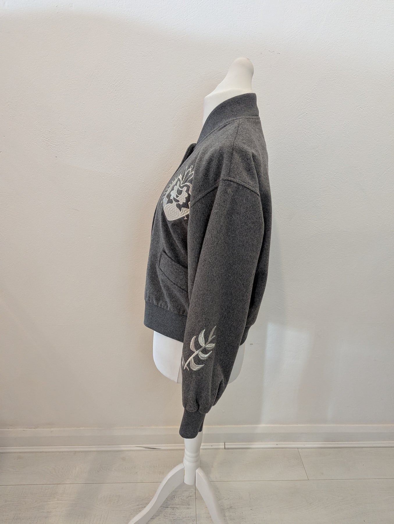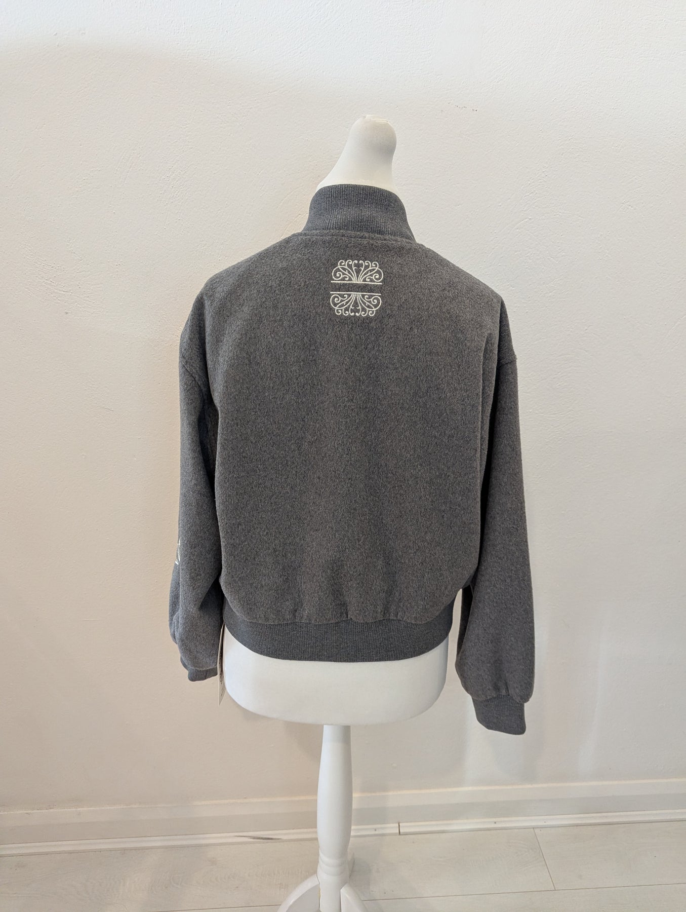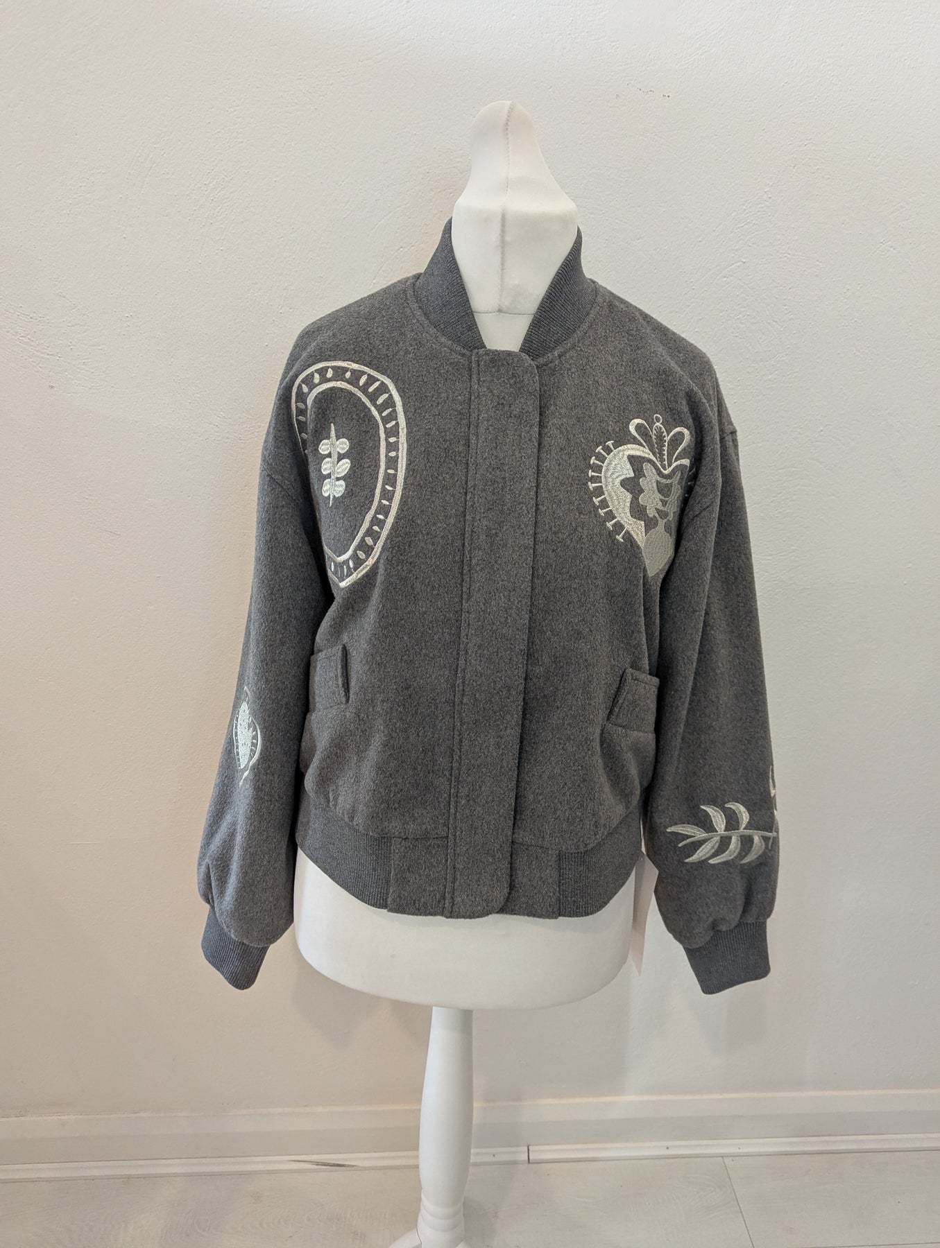 Condition: New with tags RRP £199. The Never Fully Dressed brushed-knit bomber jacket features a stand collar, dropped shoulders, designer embroidery, two front slip pockets, ribbed trims and full lining. It has concealed press-stud and zip fastenings through the front. The garment is made of 58% polyester, 33% wool, 6% polyamide, 2% viscose, and 1% acrylic, with 100% polyester lining