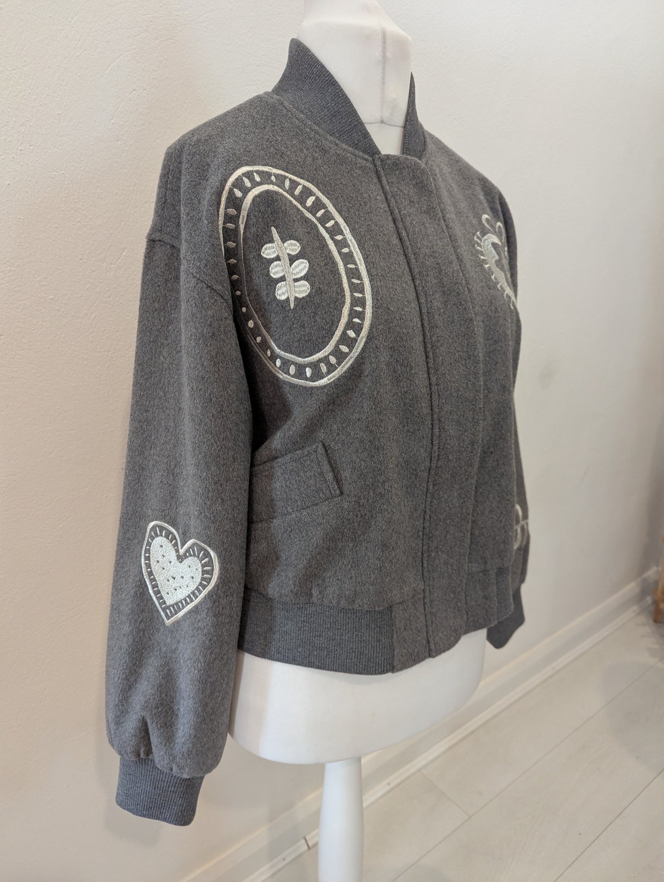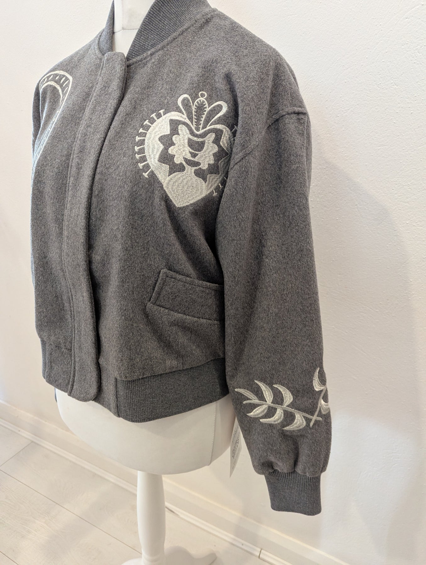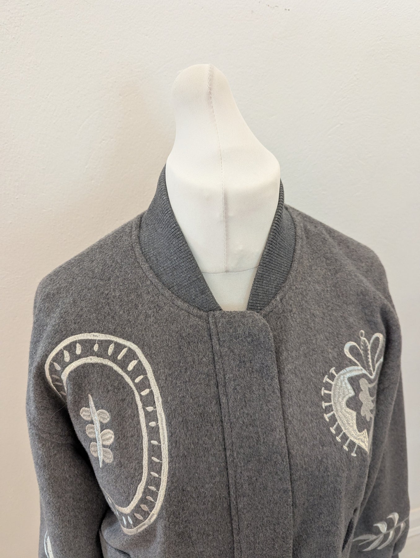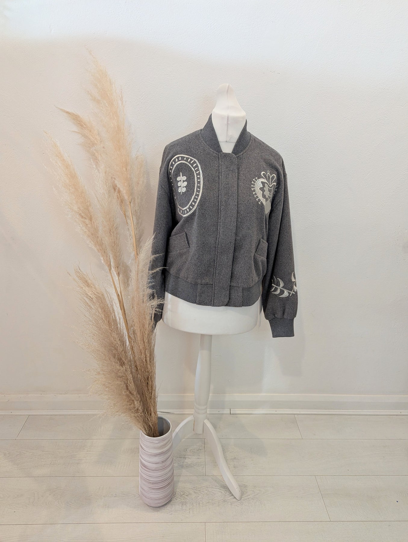 Condition: New with tags RRP £199. The Never Fully Dressed brushed-knit bomber jacket features a stand collar, dropped shoulders, designer embroidery, two front slip pockets, ribbed trims and full lining. It has concealed press-stud and zip fastenings through the front. The garment is made of 58% polyester, 33% wool, 6% polyamide, 2% viscose, and 1% acrylic, with 100% polyester lining