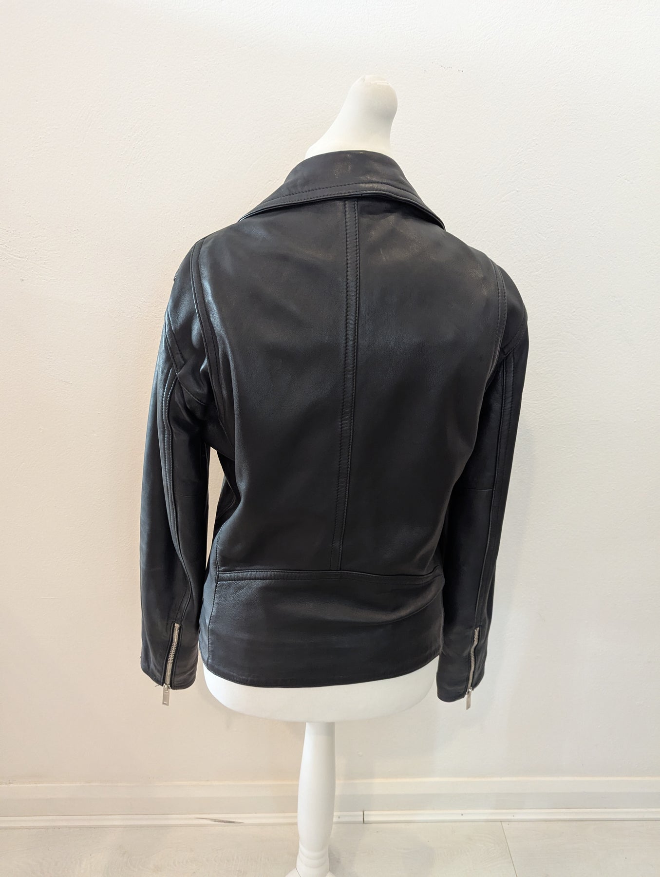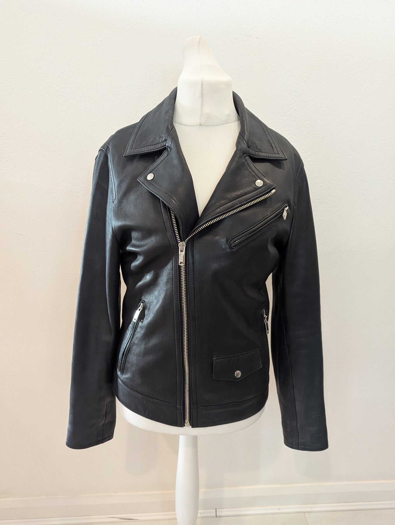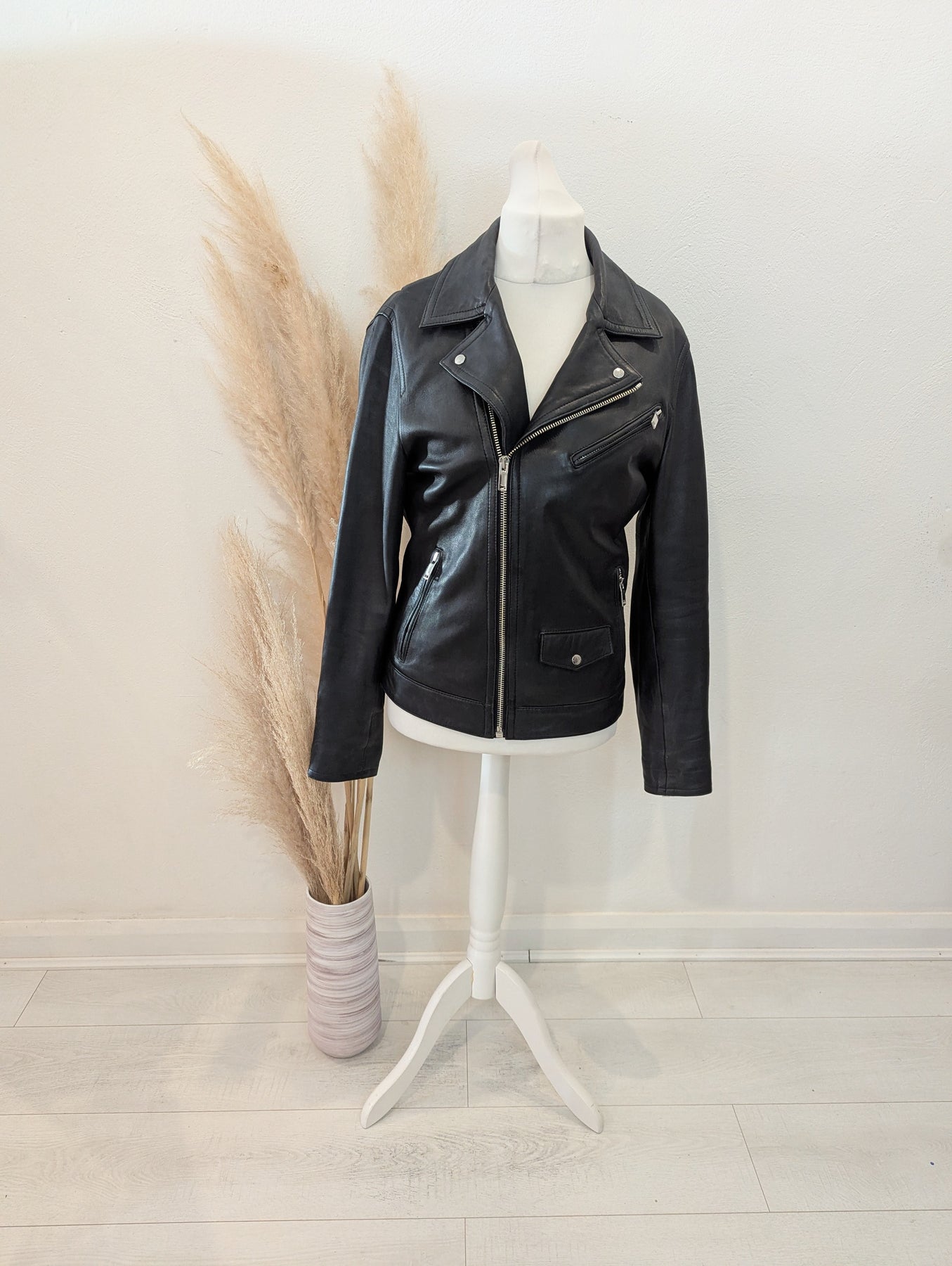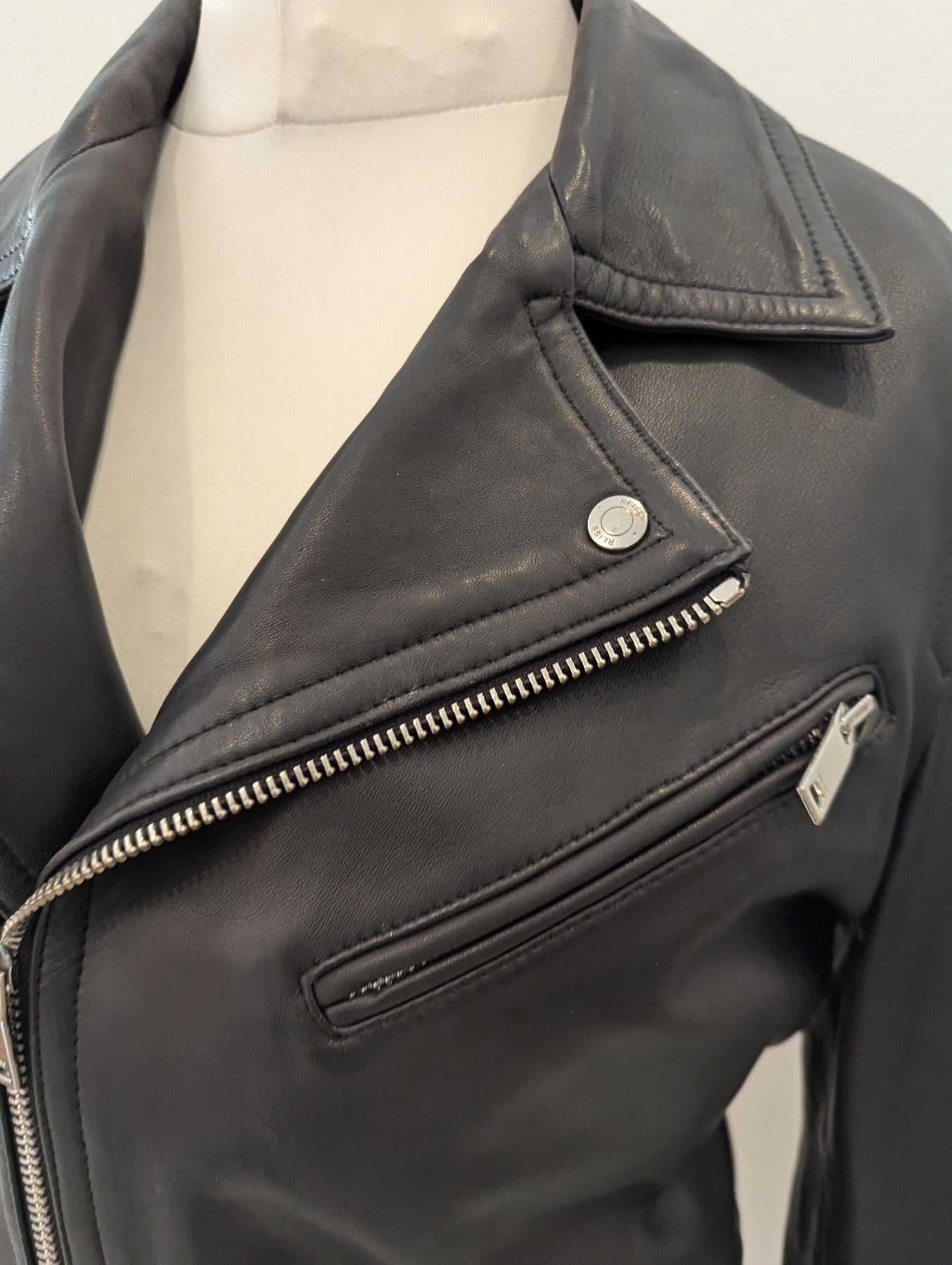 Condition: Excellent preloved condition no signs of wear. A leather jacket is a must in any wardrobe. This longer length biker is made from buttery soft leather with contrasting silver hardware