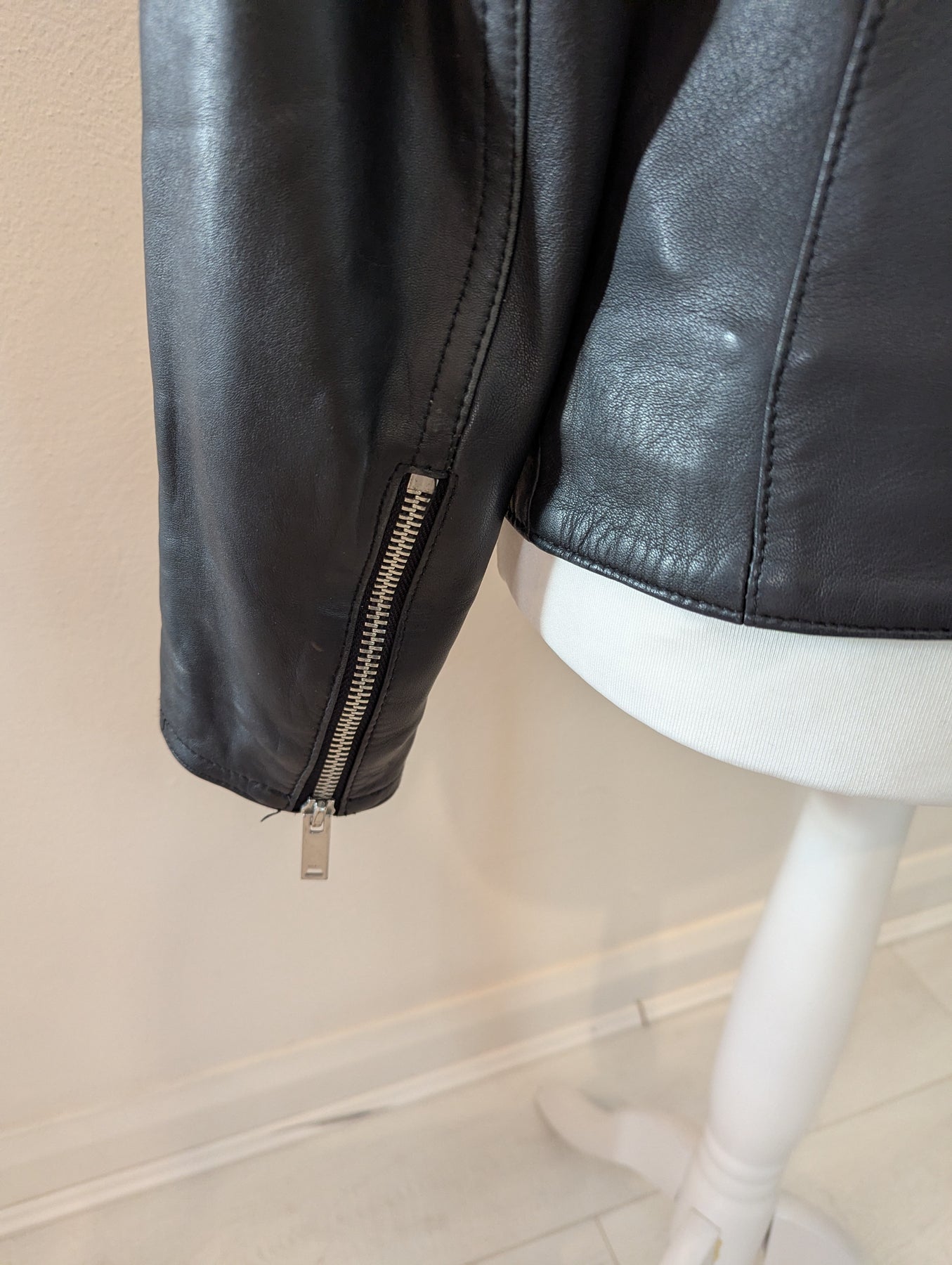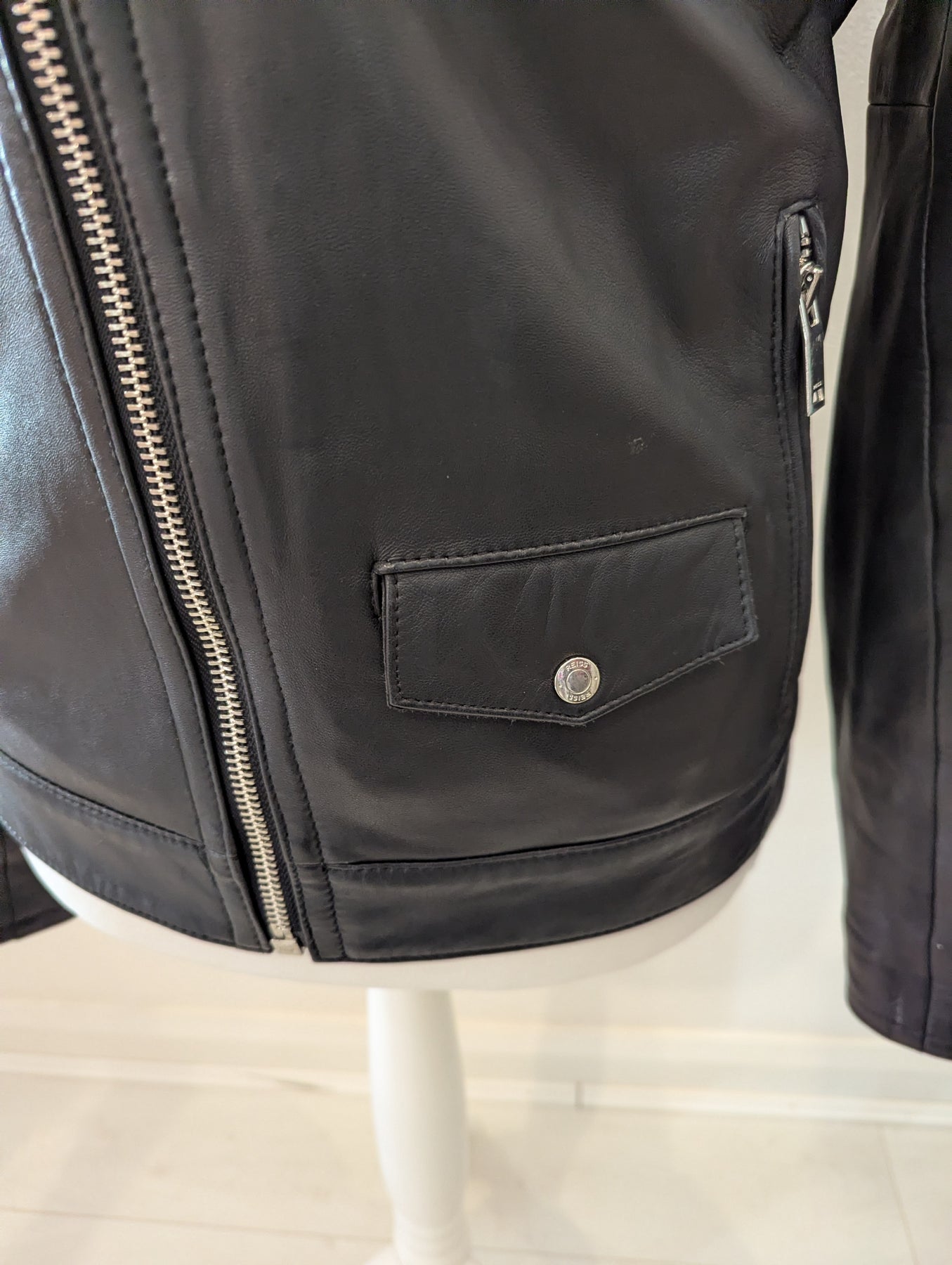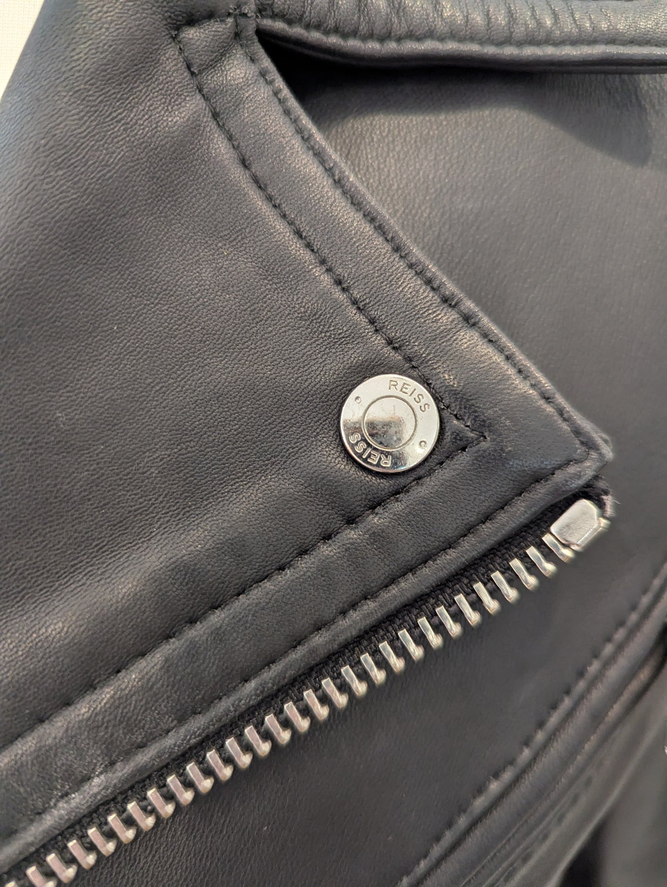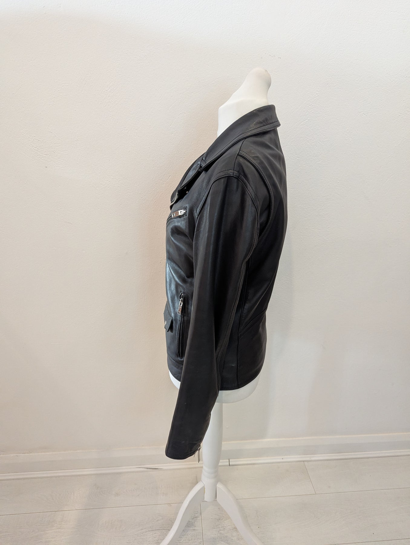 Condition: Excellent preloved condition no signs of wear. A leather jacket is a must in any wardrobe. This longer length biker is made from buttery soft leather with contrasting silver hardware