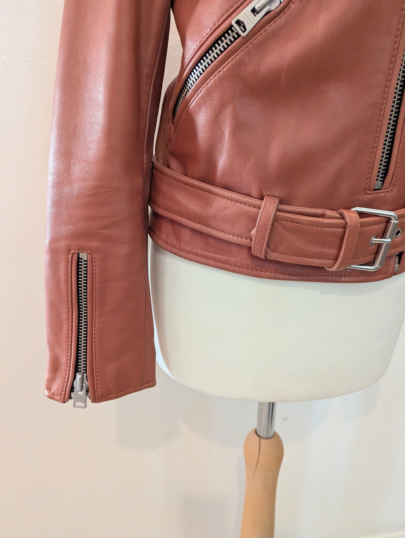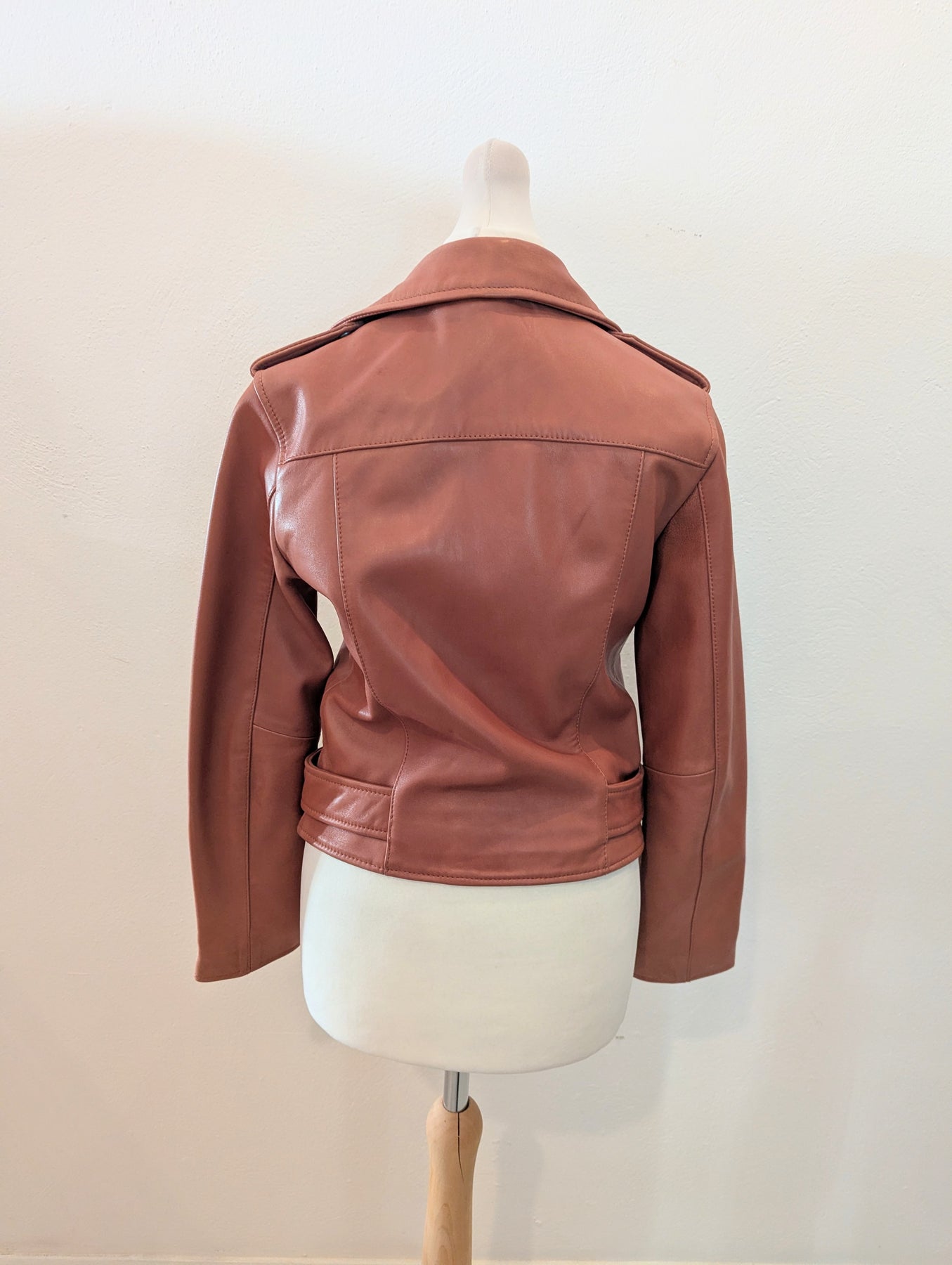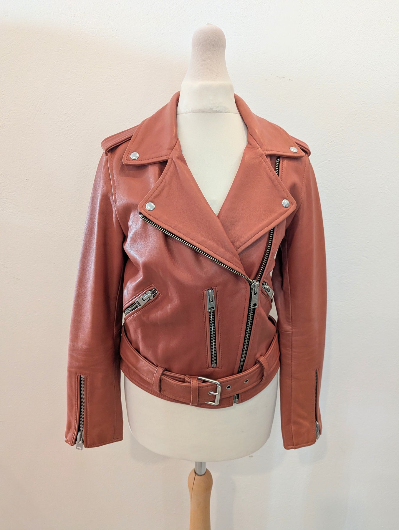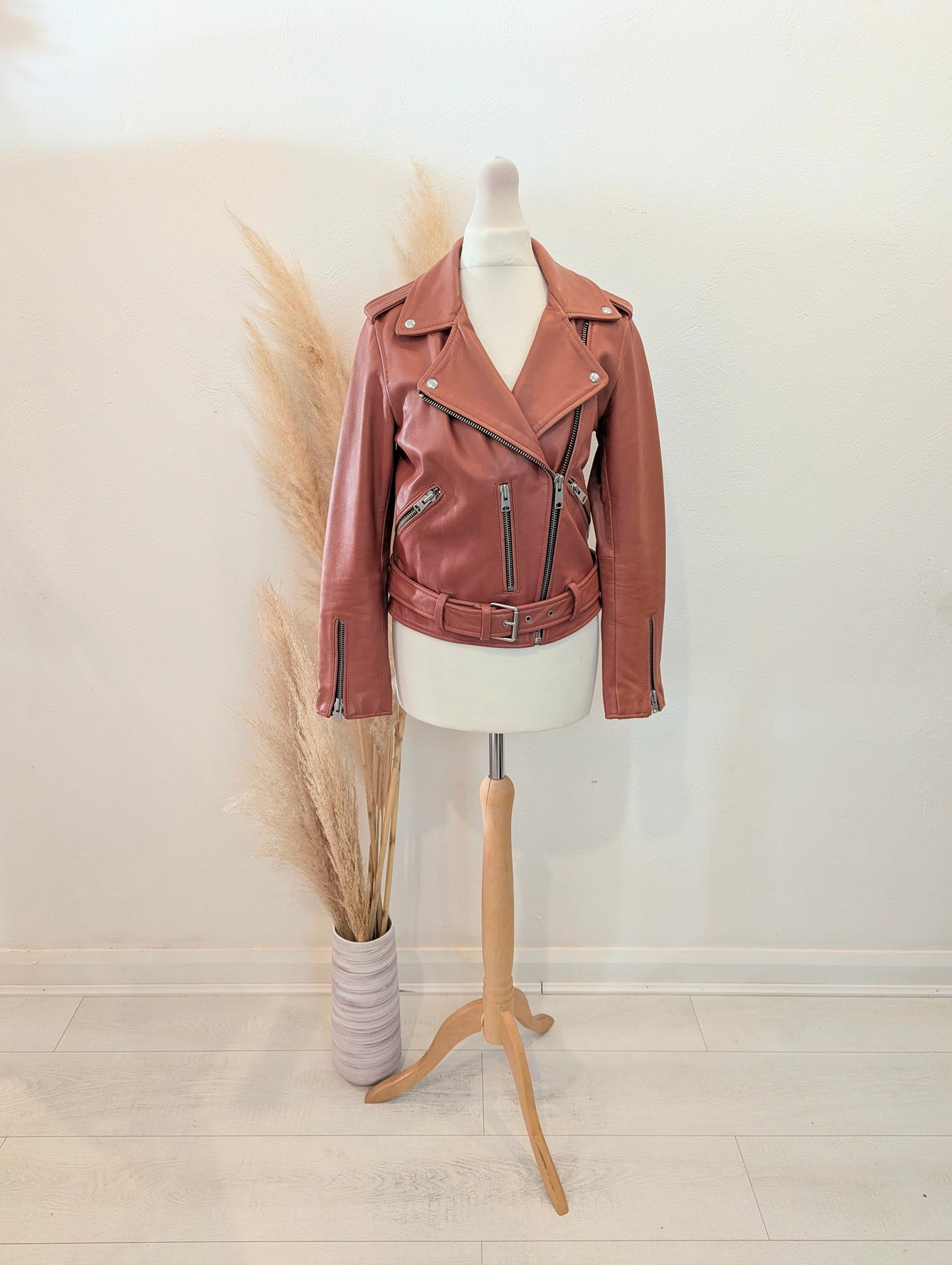 Condition: Excellent preloved condition, slight fading on collar. Original RRP £318. The iconic Balfern Biker Jacket features traditional metal trims that sit against a buttery soft, Rose wood pink leather base. Motorbike optional. 100% sheep leather
