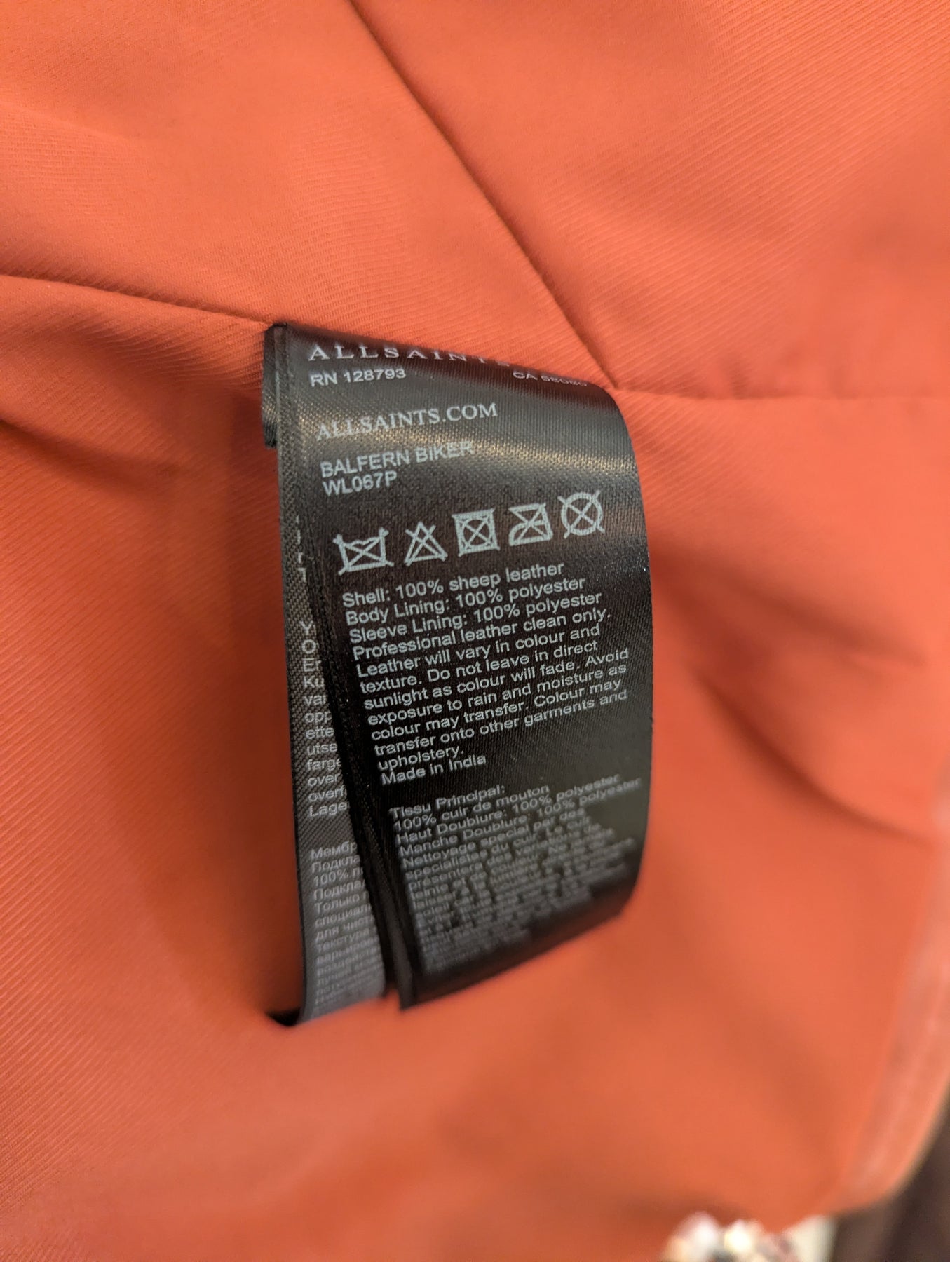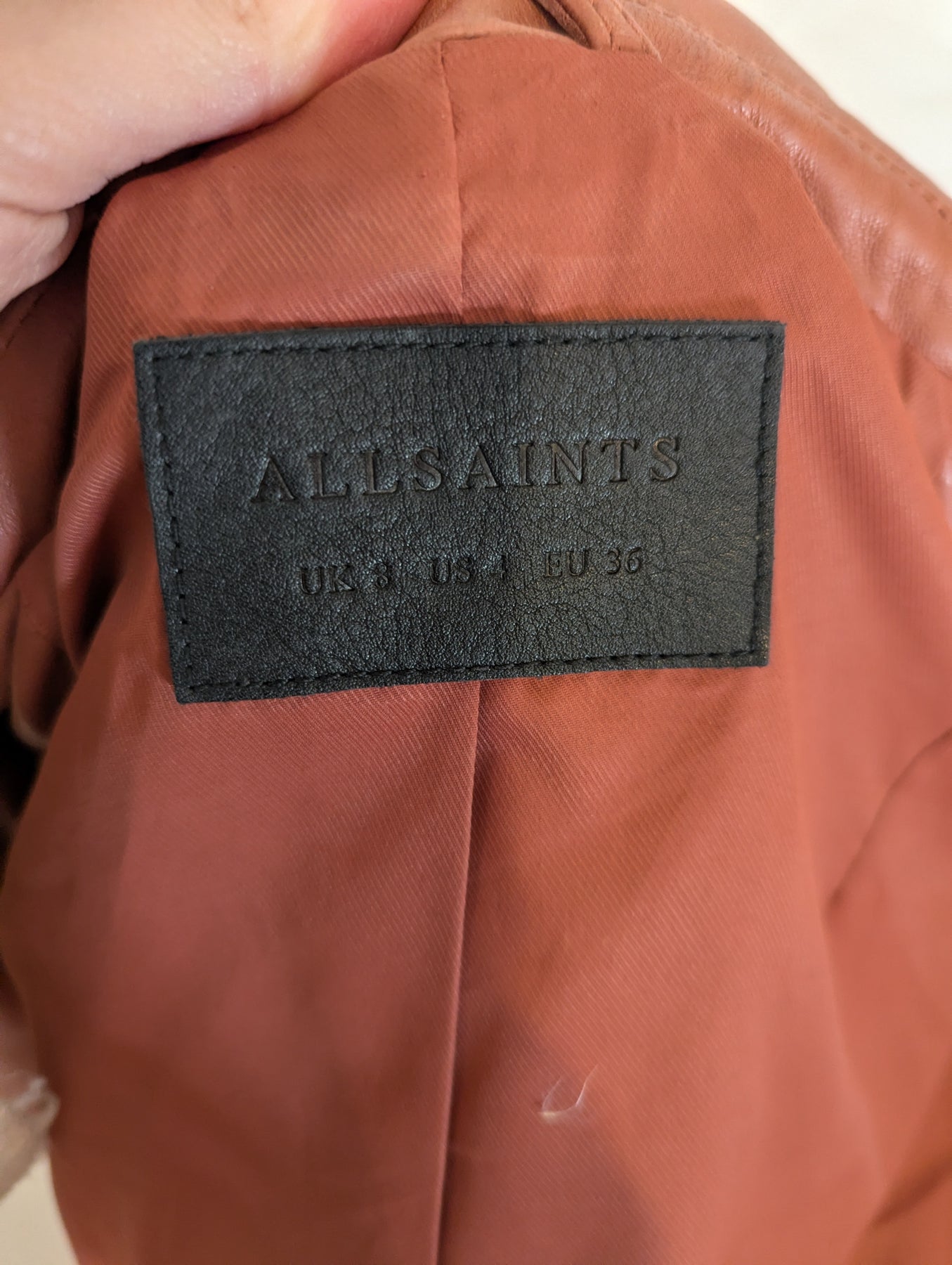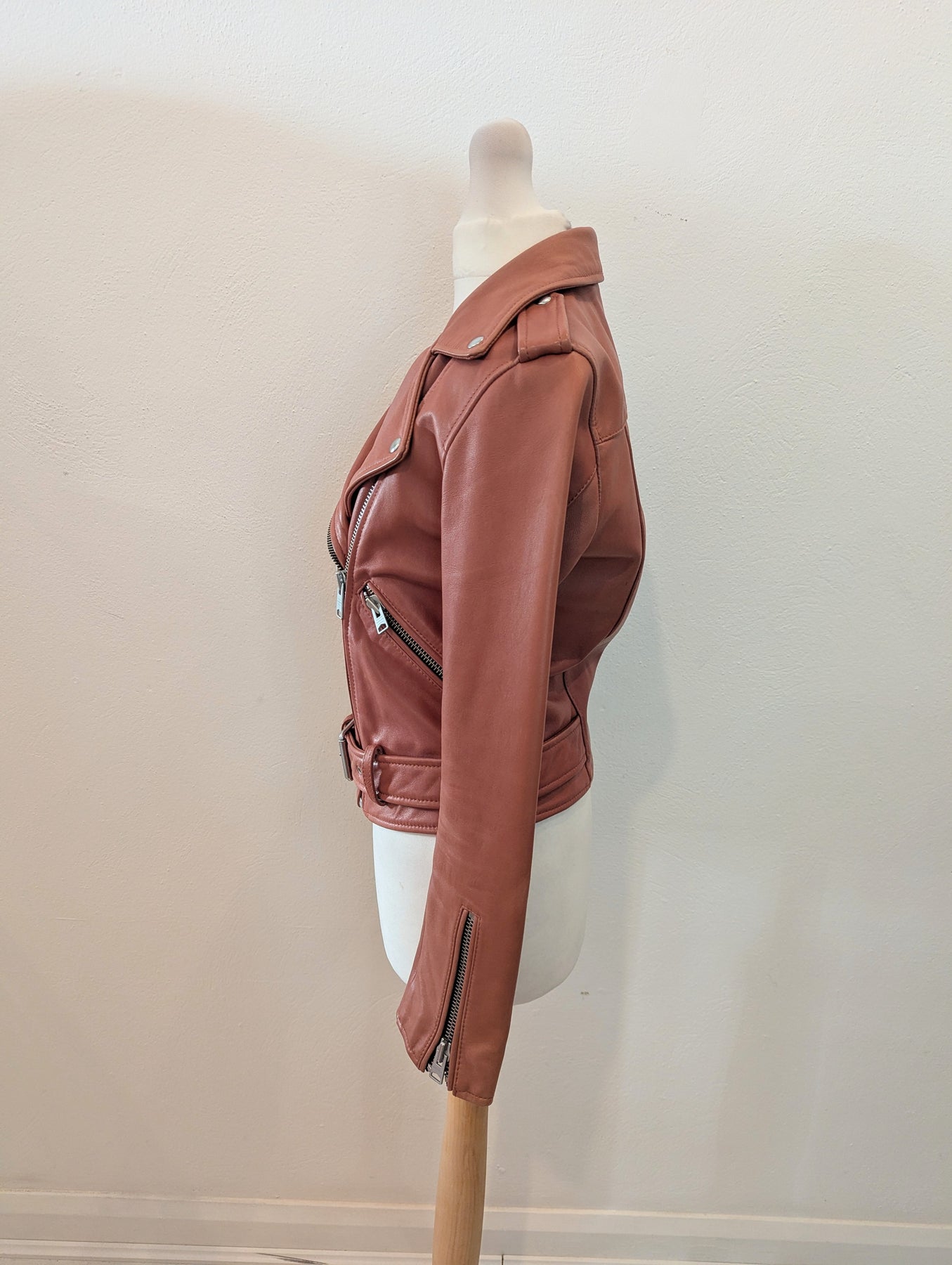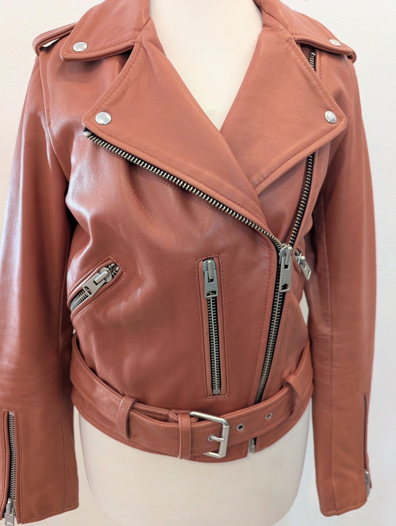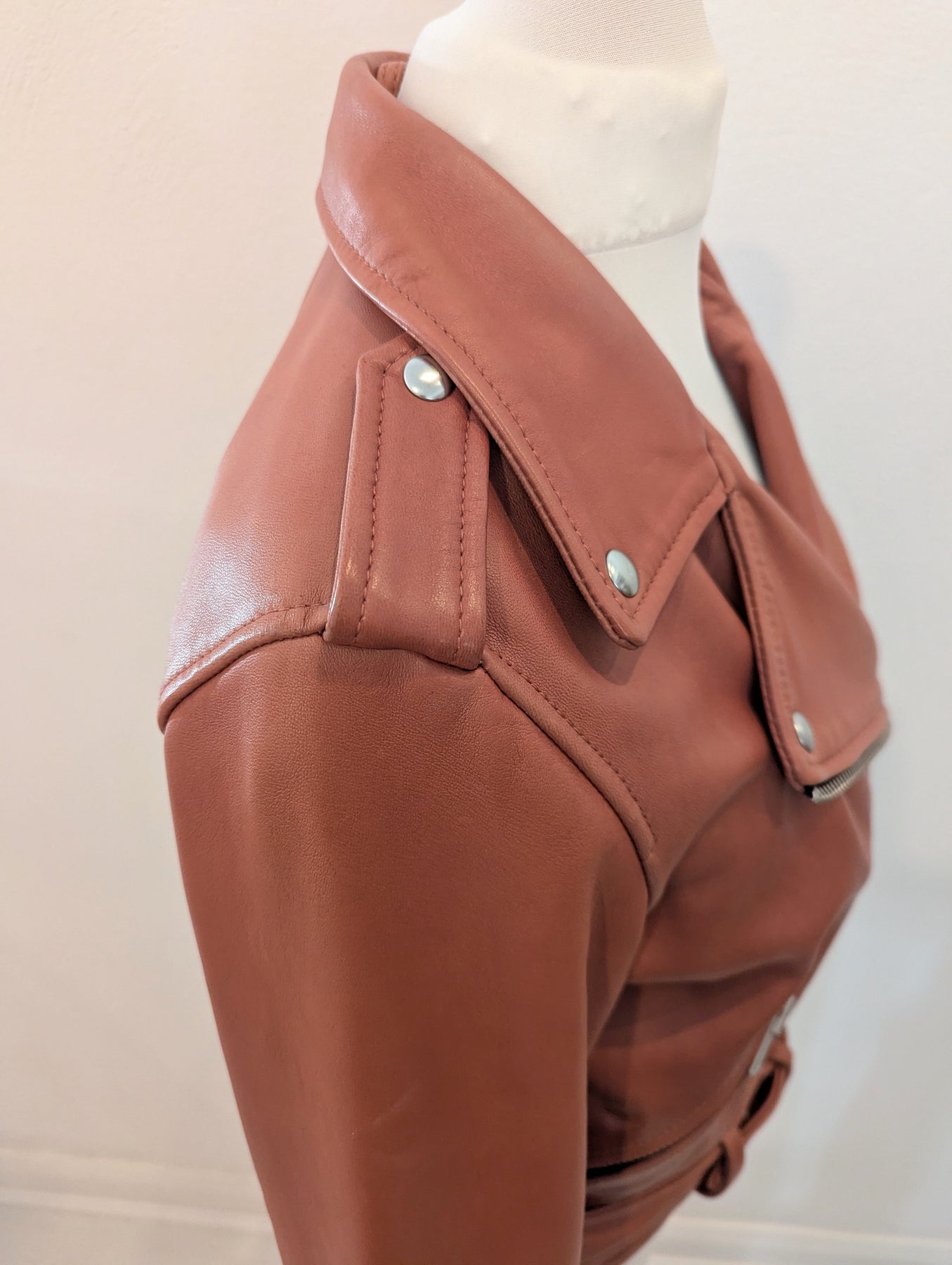 Condition: Excellent preloved condition, slight fading on collar. Original RRP £318. The iconic Balfern Biker Jacket features traditional metal trims that sit against a buttery soft, Rose wood pink leather base. Motorbike optional. 100% sheep leather