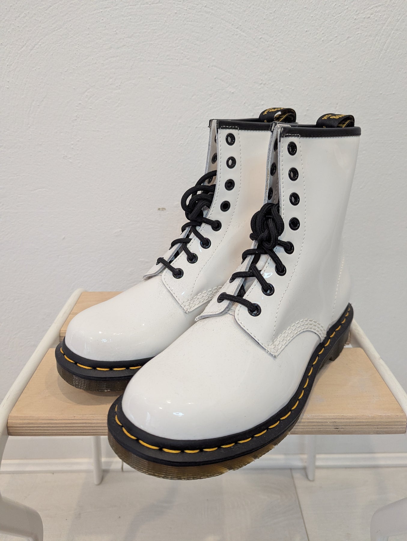 Condition: As new RRP £130. The high-shine Patent Lamper 1460 boot stays true to its Original construction, with the unmistakable yellow welt stitching, a scripted AirWair heel loop, and a rugged air-cushioned sole. Coated in glossy fine-grained leather, these boots make a bold statement.