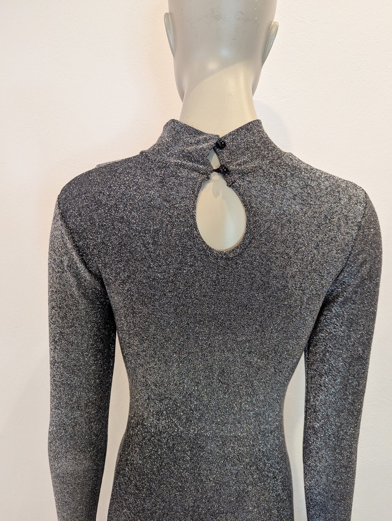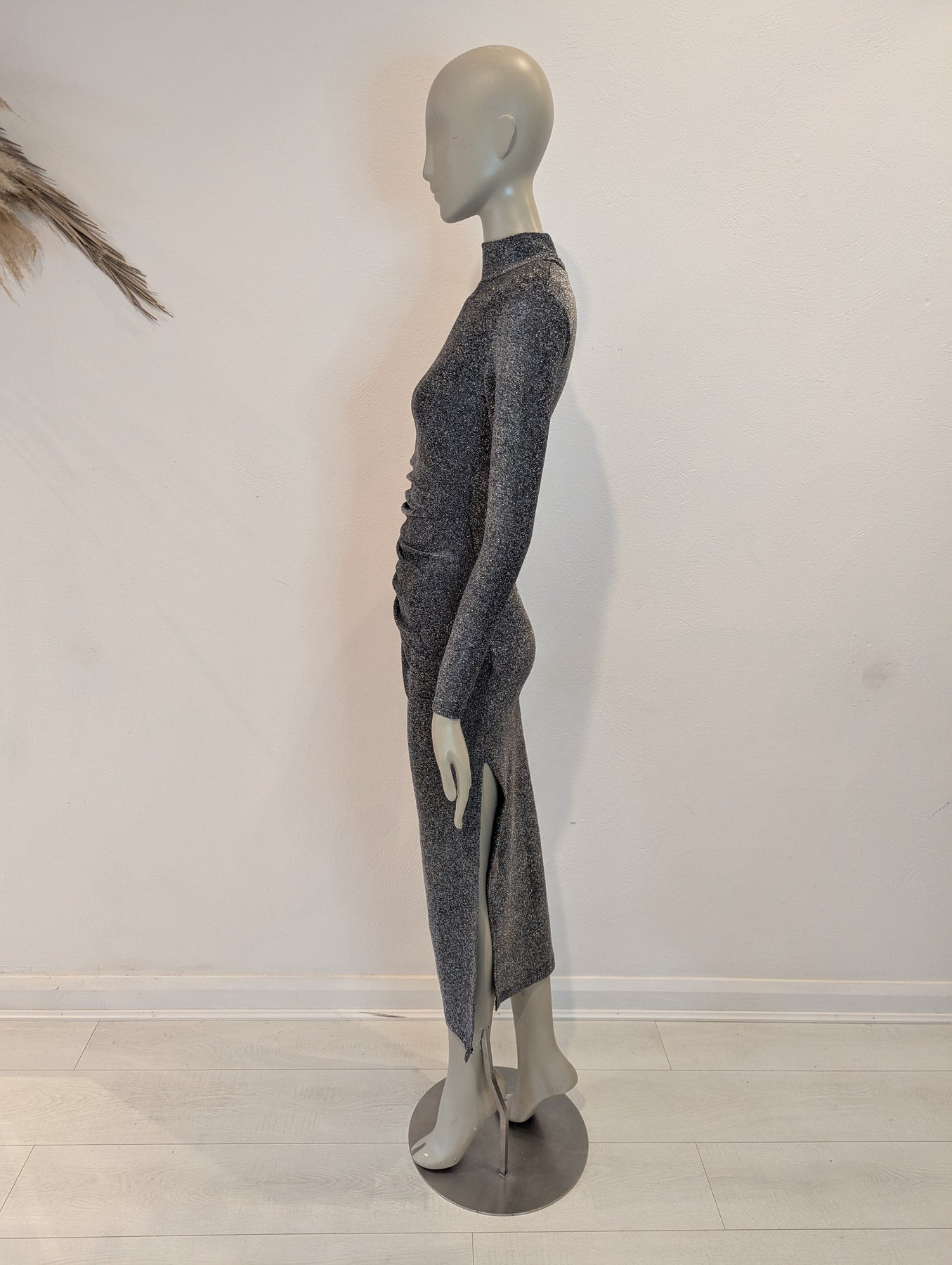 Condition: Excellent preloved condition no signs of wear. Figure hugging mesh dress with silver sparkle, the high neck and side ruching give it an elegant edge
