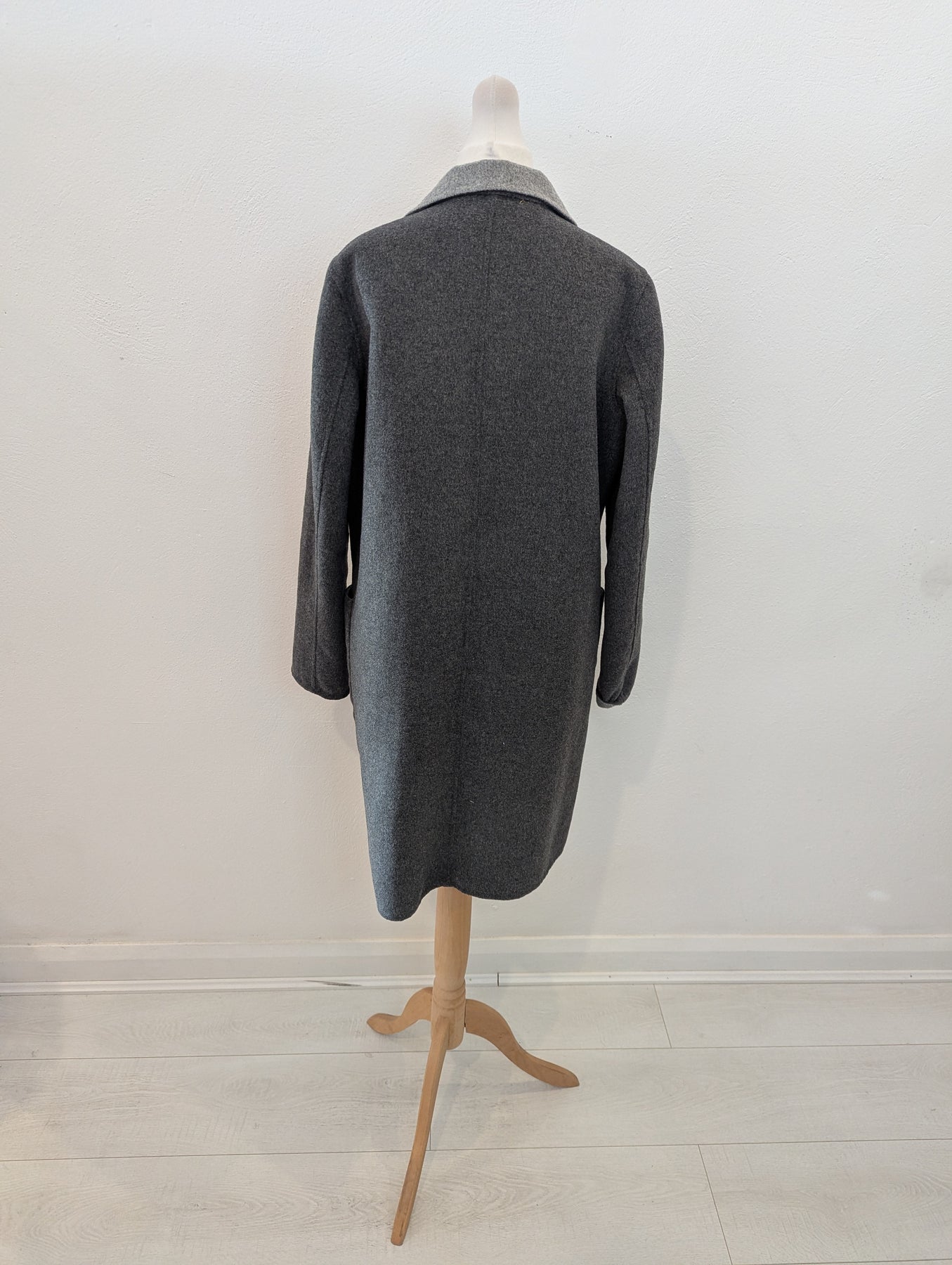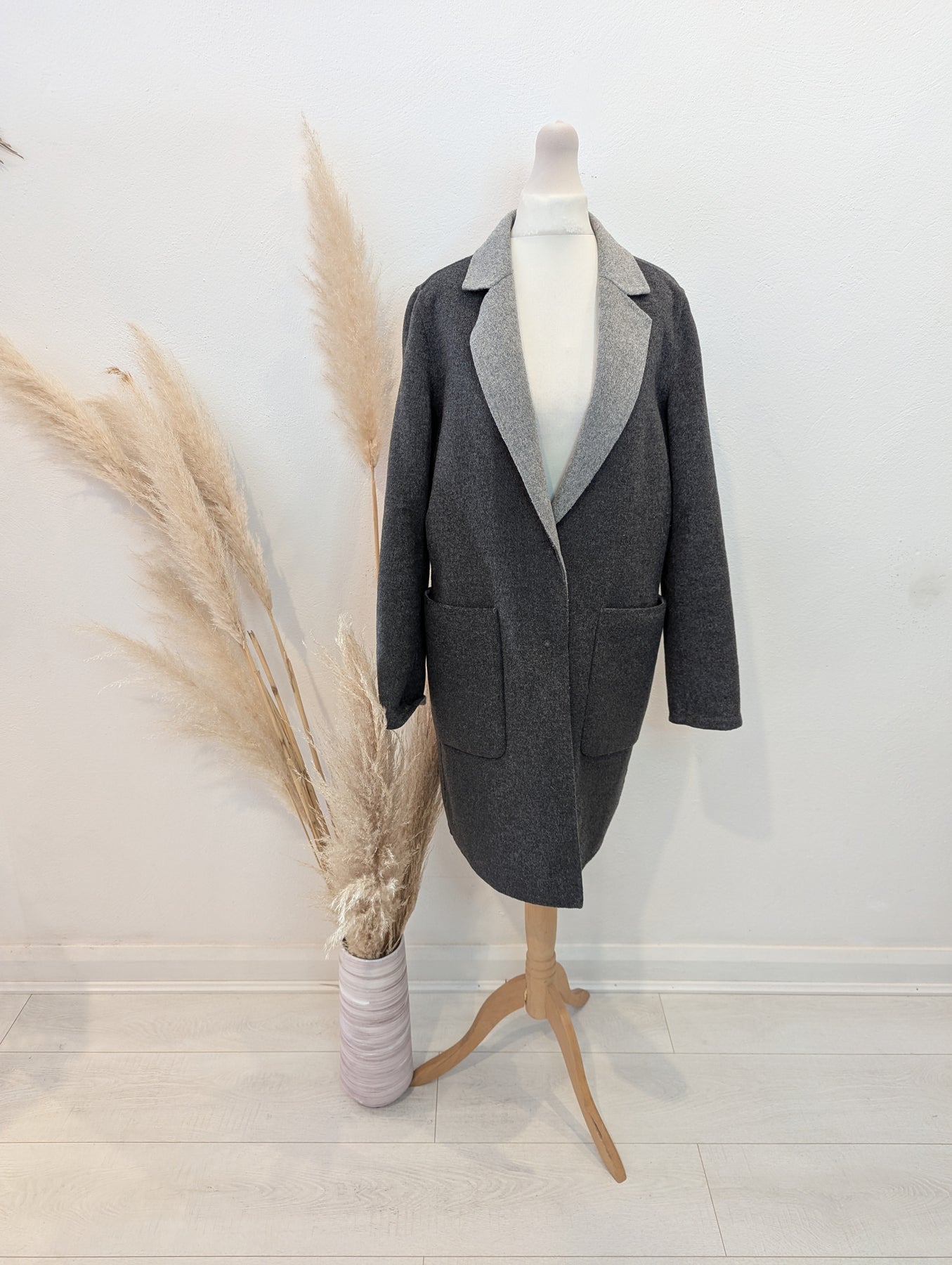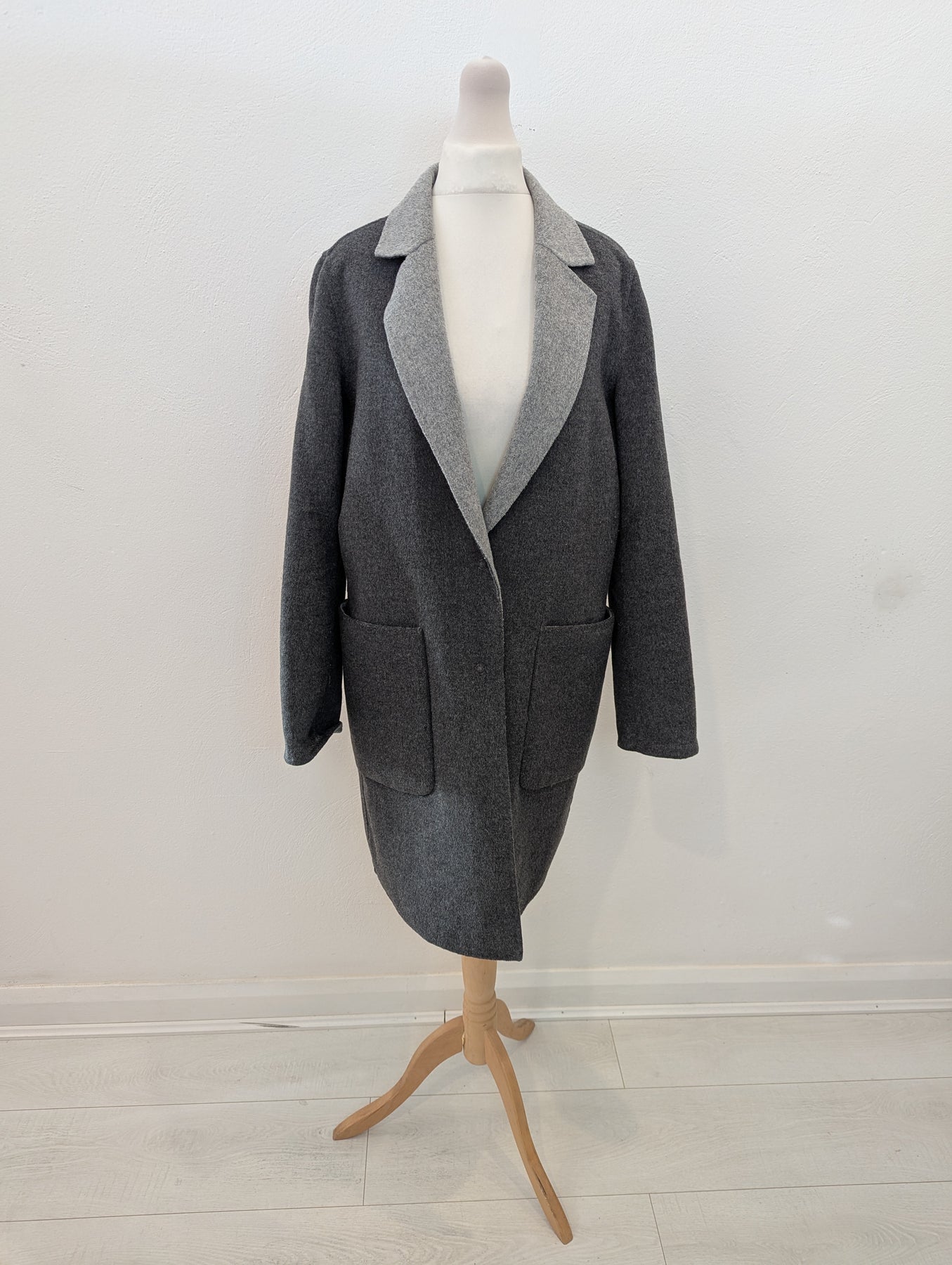 Condition: Very good preloved condition, some balling due to nature of material. Cosy but stylish wool blend coat from Sisley with formal collar. Pockets on dark grey side only. 70% polyester, 30% wool