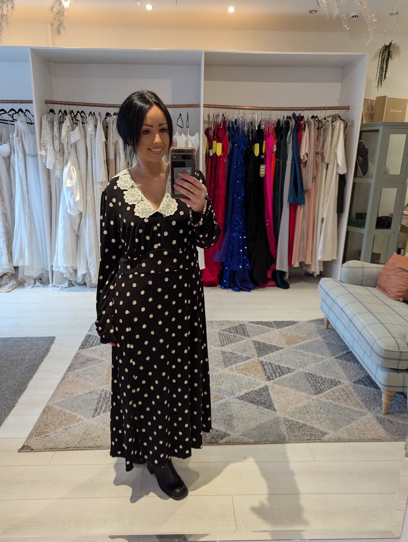Condition: Excellent preloved condition no signs of wear. Nothing beats vintage. Inspired by the 50s and featuring a floral lace collar and beige spotty backdrop. The long sleeves and midi length make it suitable for styling through spring as much as winter (with the help of some tights and boots). Finished with pearlescent buttons through the bodice.