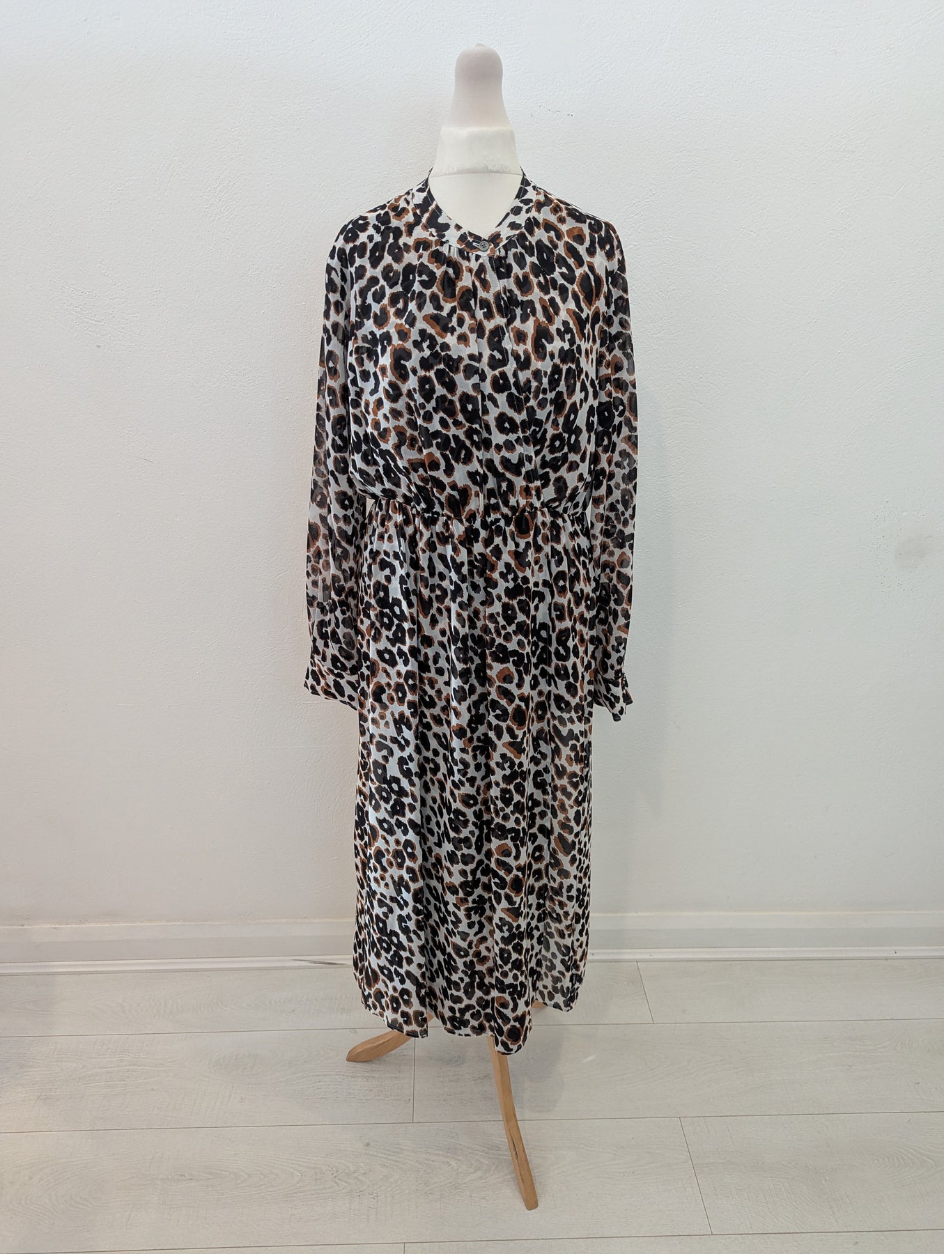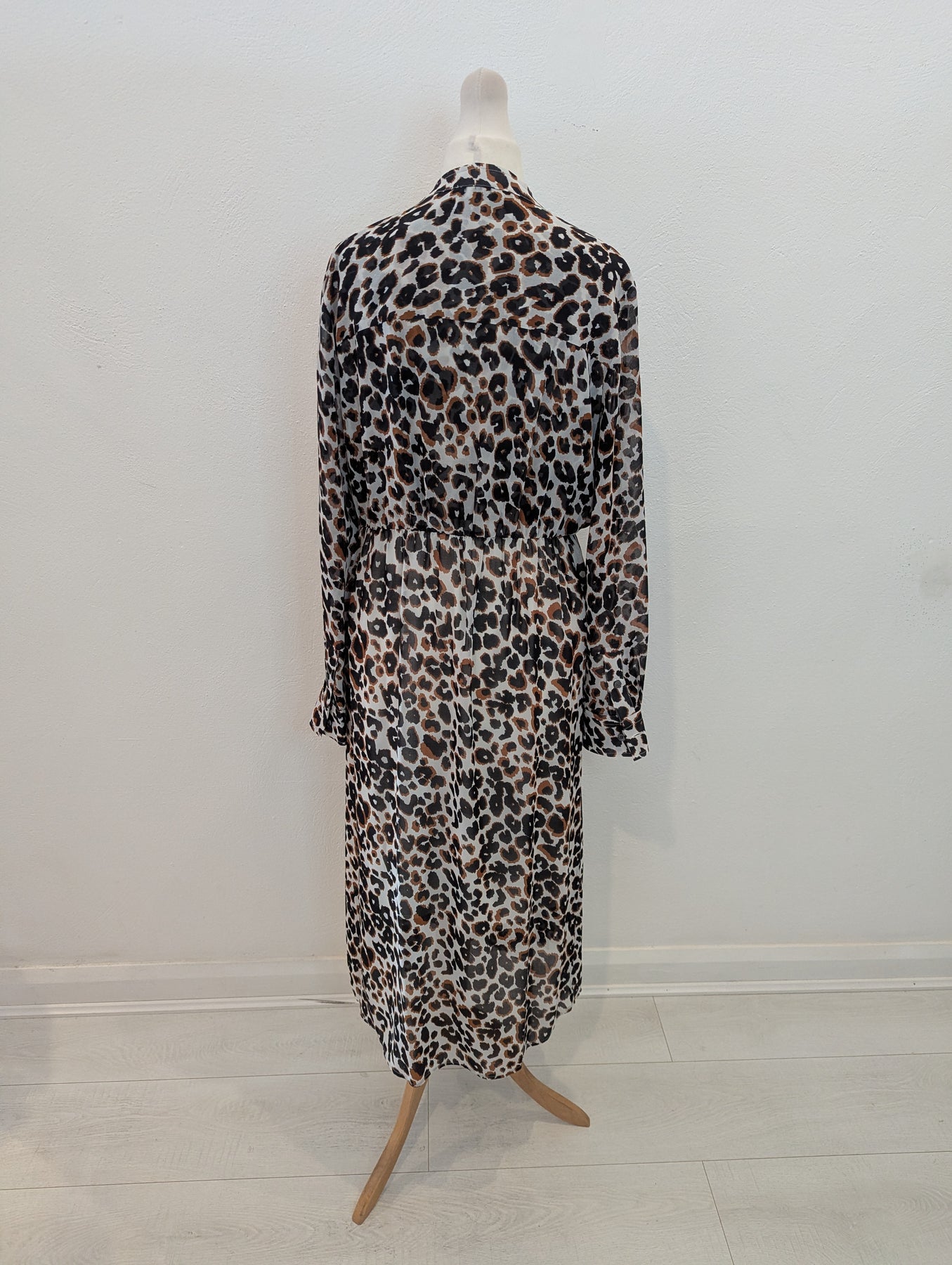Condition: Excellent preloved condition no signs of wear. Style this Calvin Klein leopard print midi dress the way you feel with trainers or knee boots. Round, button neck with side zip