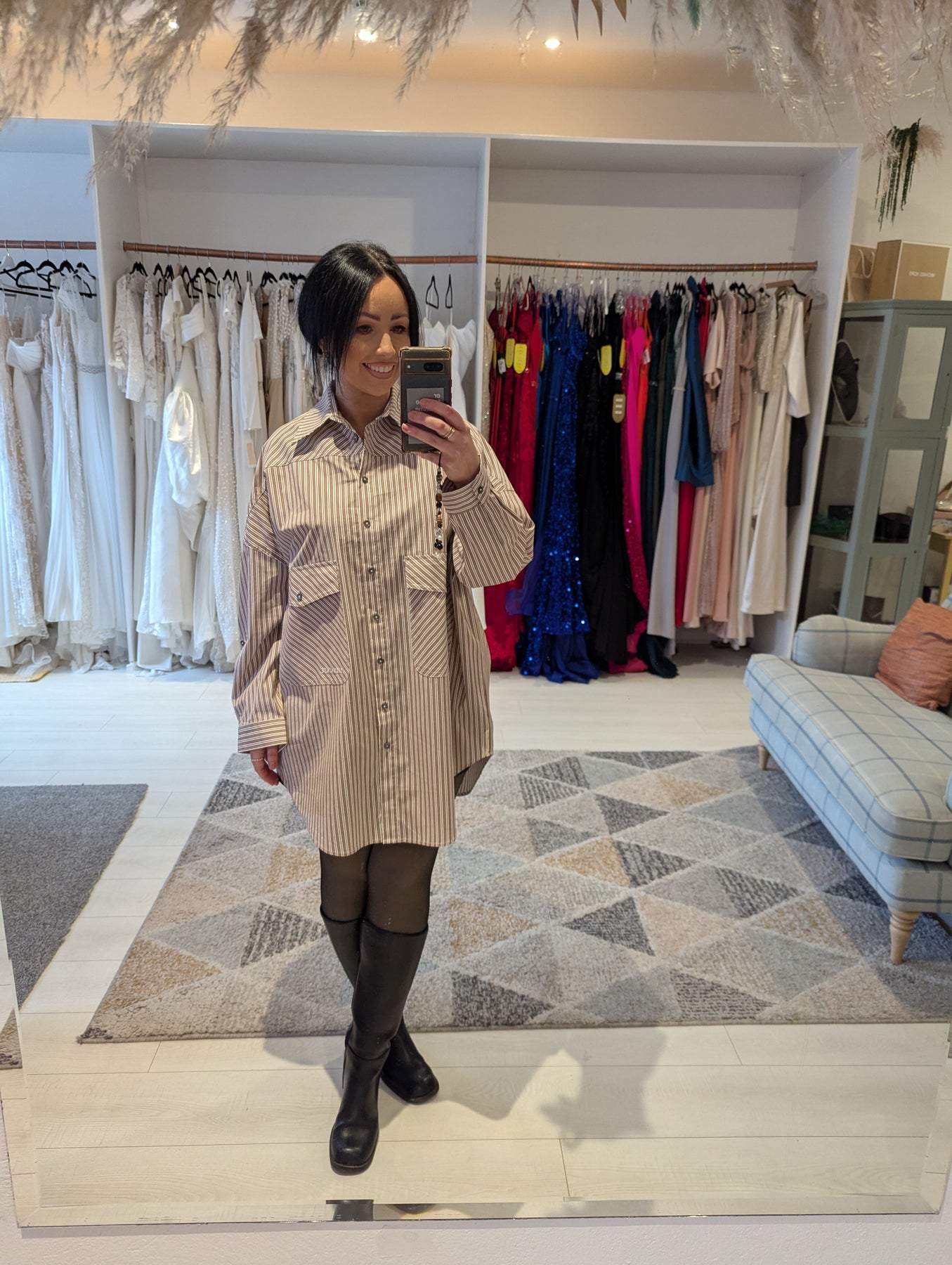 Condition: Excellent preloved condition no signs of wear. Original RRP £168. Introducing the Sunday Shirt from Dawn x Dare. The Sunday Shirt is an oversized shirt that can be worn as both a long shirt and short dress. Crafted from 100% cotton, this boyish shirt features a large pointed collar, button closure, large patch pockets with Dawn x Dare branding, a slightly rounded hemline and stripes throughout in various directions. The sleeves can be worn loose or rolled up using the strap attached inside.