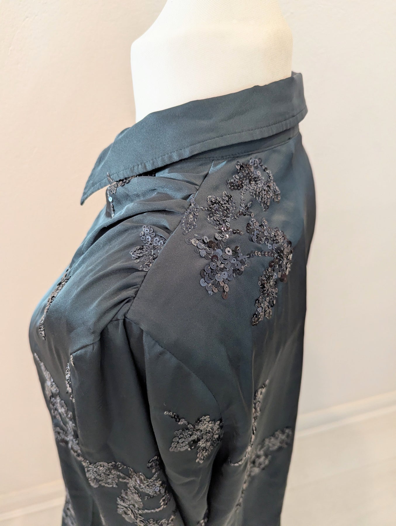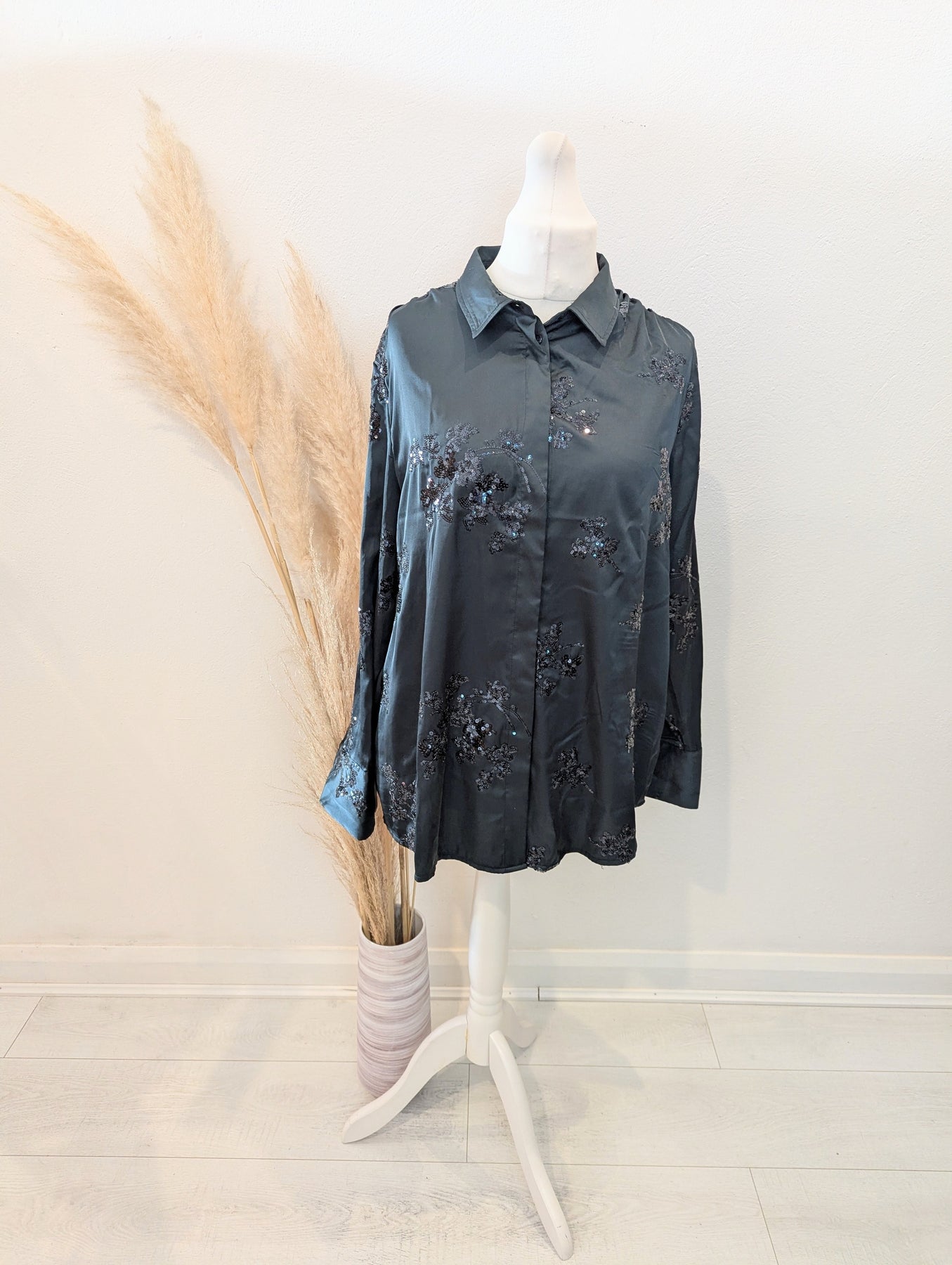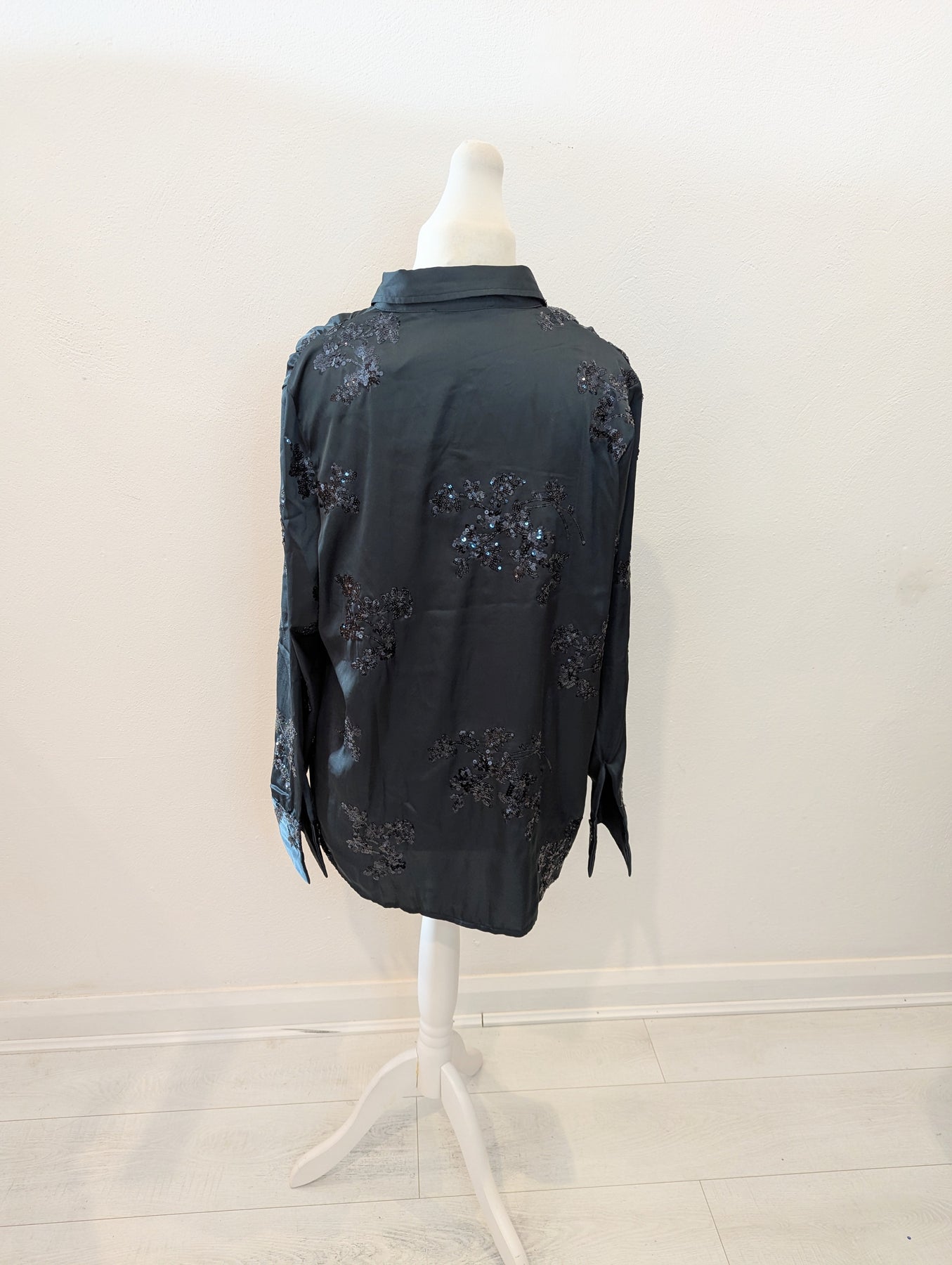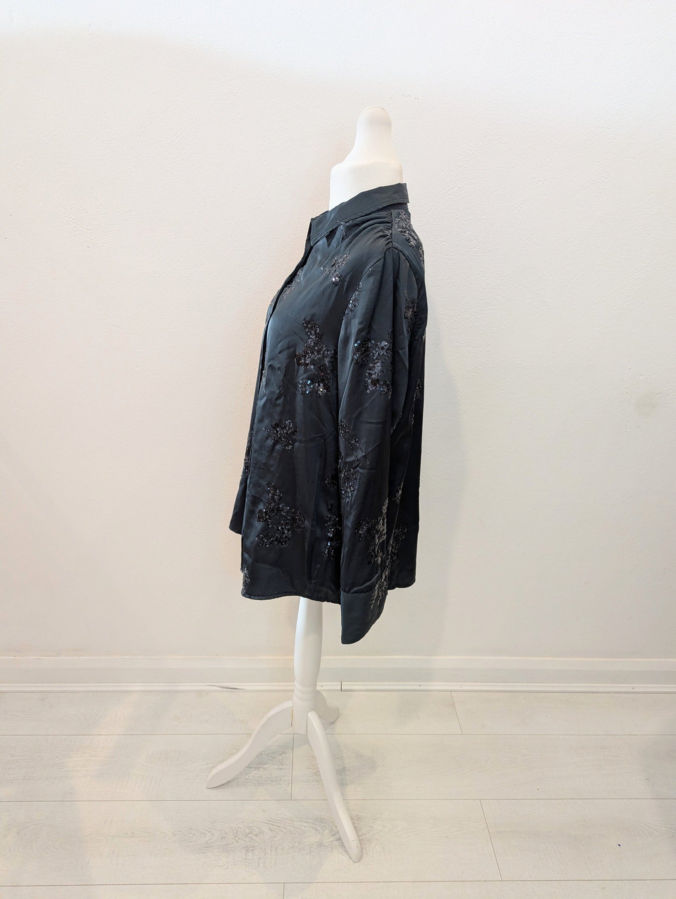 Condition: New with tags. Dark green satin shirt with sequin detailing, perfect for pairing with leather trousers or the matching trousers for an effortlessly chic co-ord