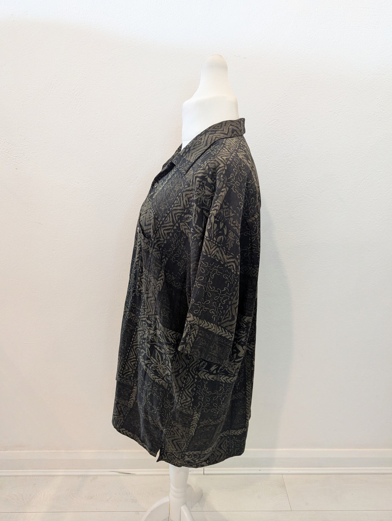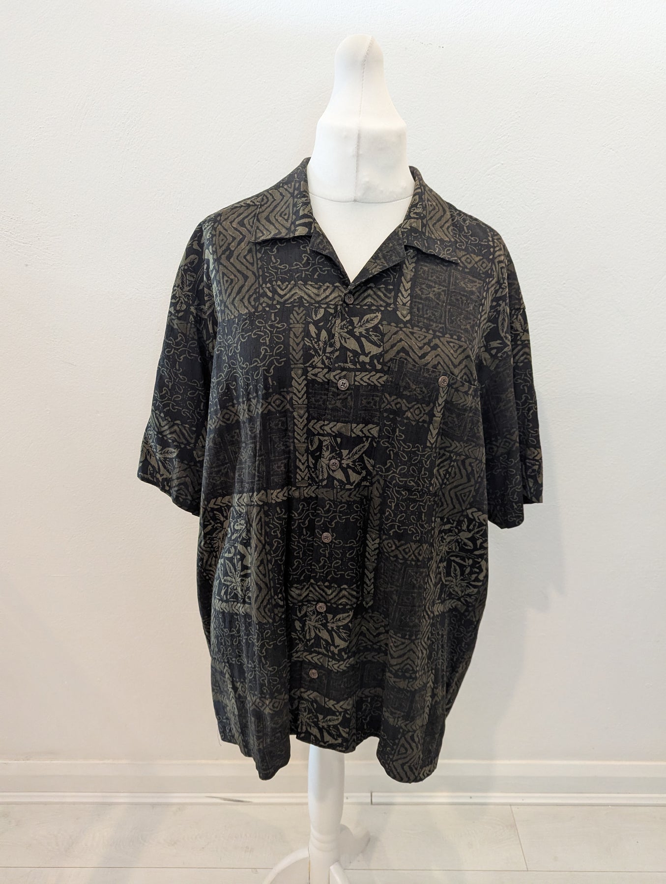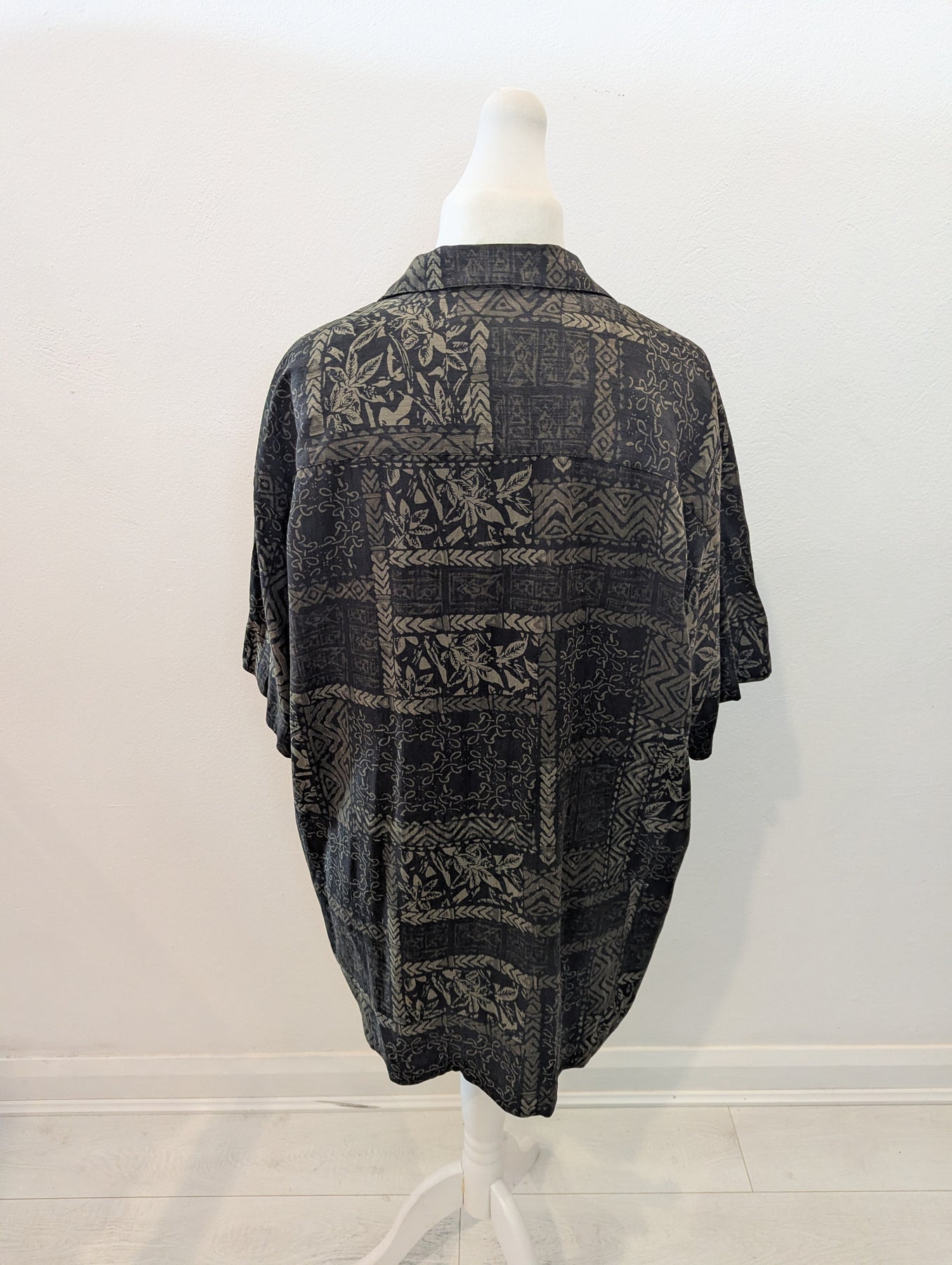 Condition: Excellent preloved condition no signs of wear. Vintage Geoffrey Beene short sleeved short in a cool print. 70% silk, 30% rayon