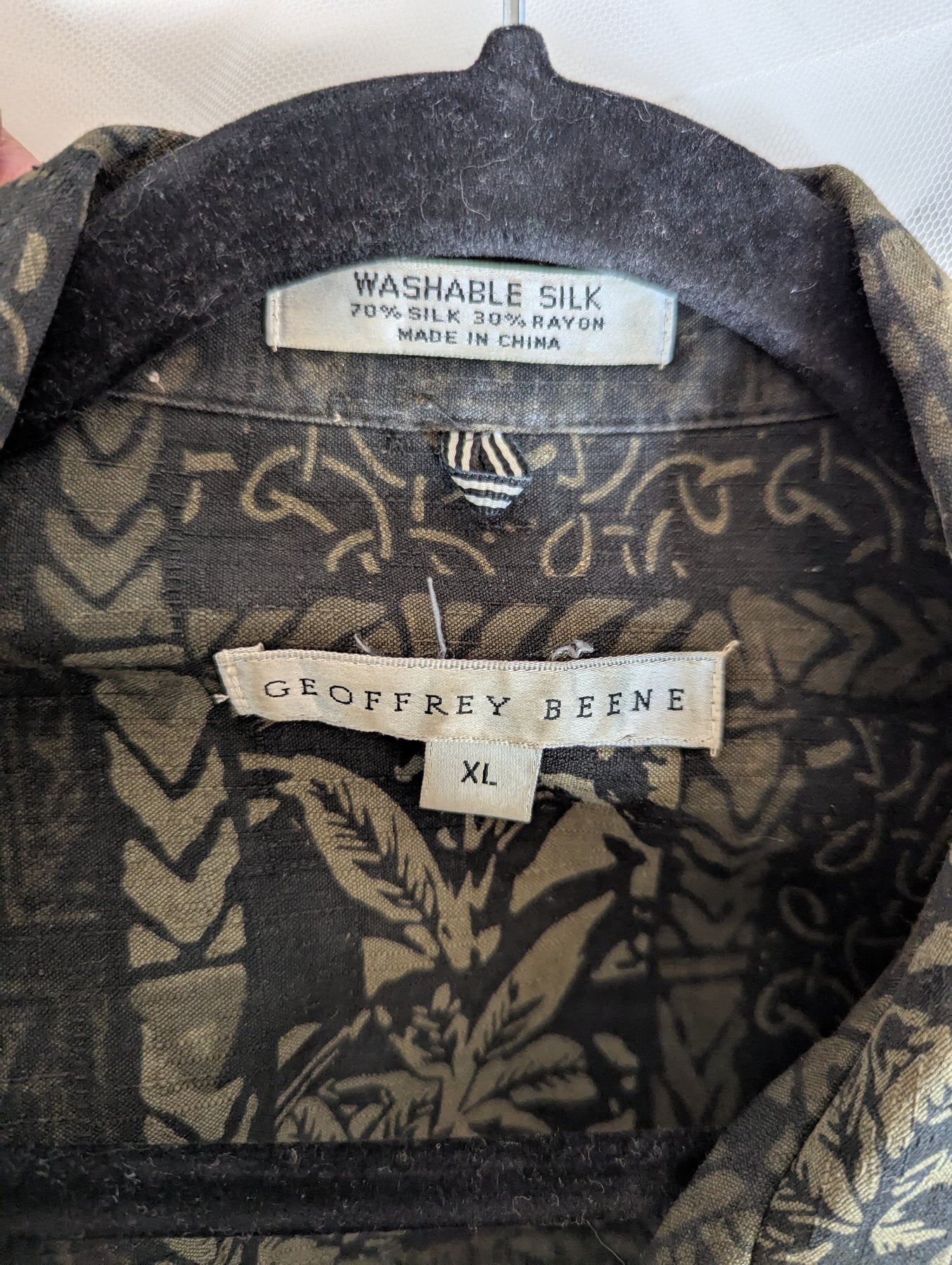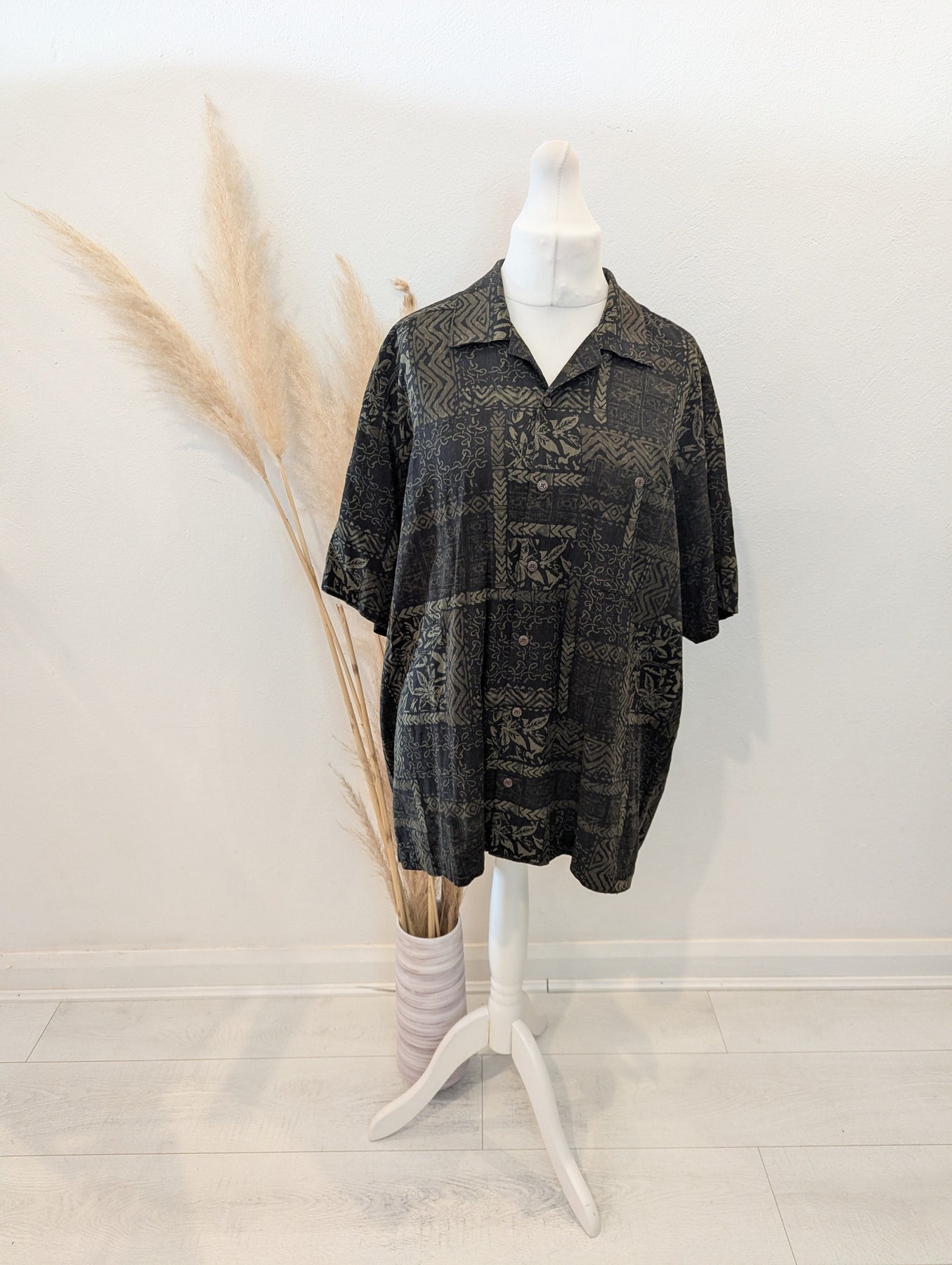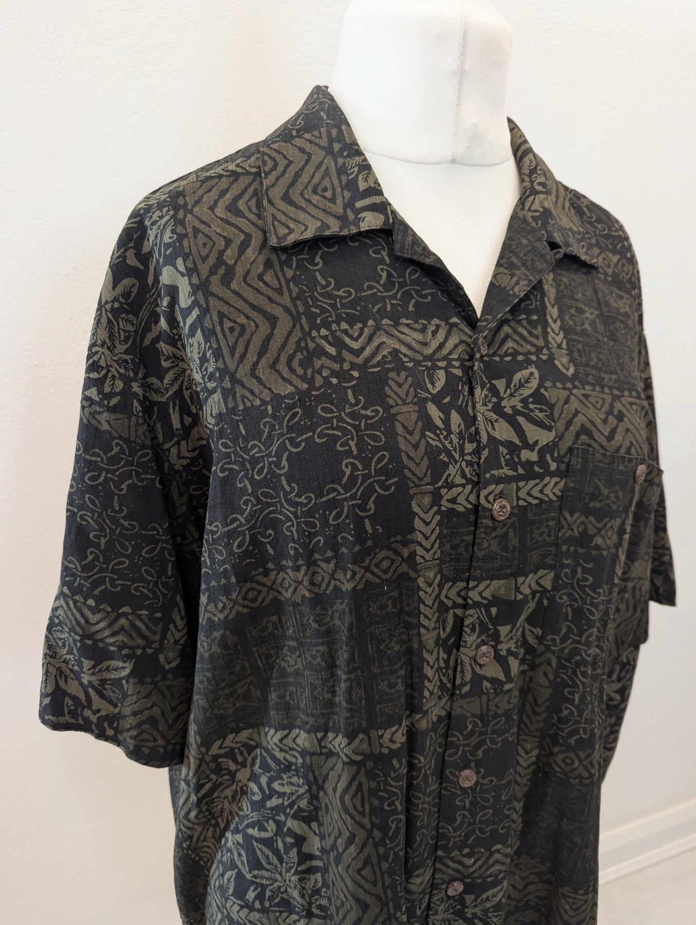 Condition: Excellent preloved condition no signs of wear. Vintage Geoffrey Beene short sleeved short in a cool print. 70% silk, 30% rayon
