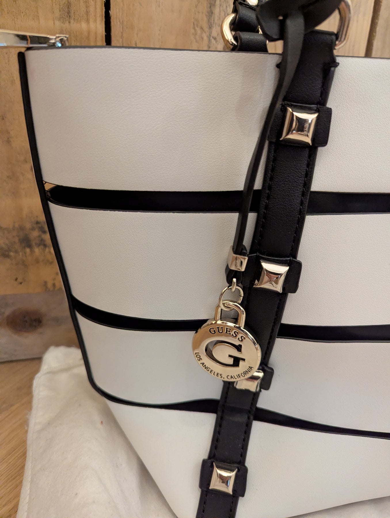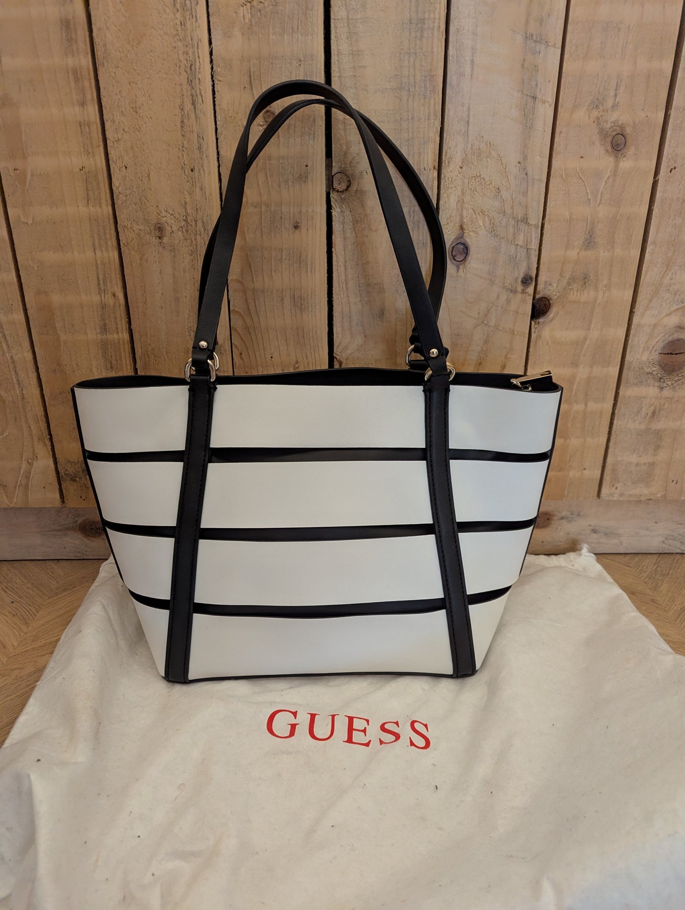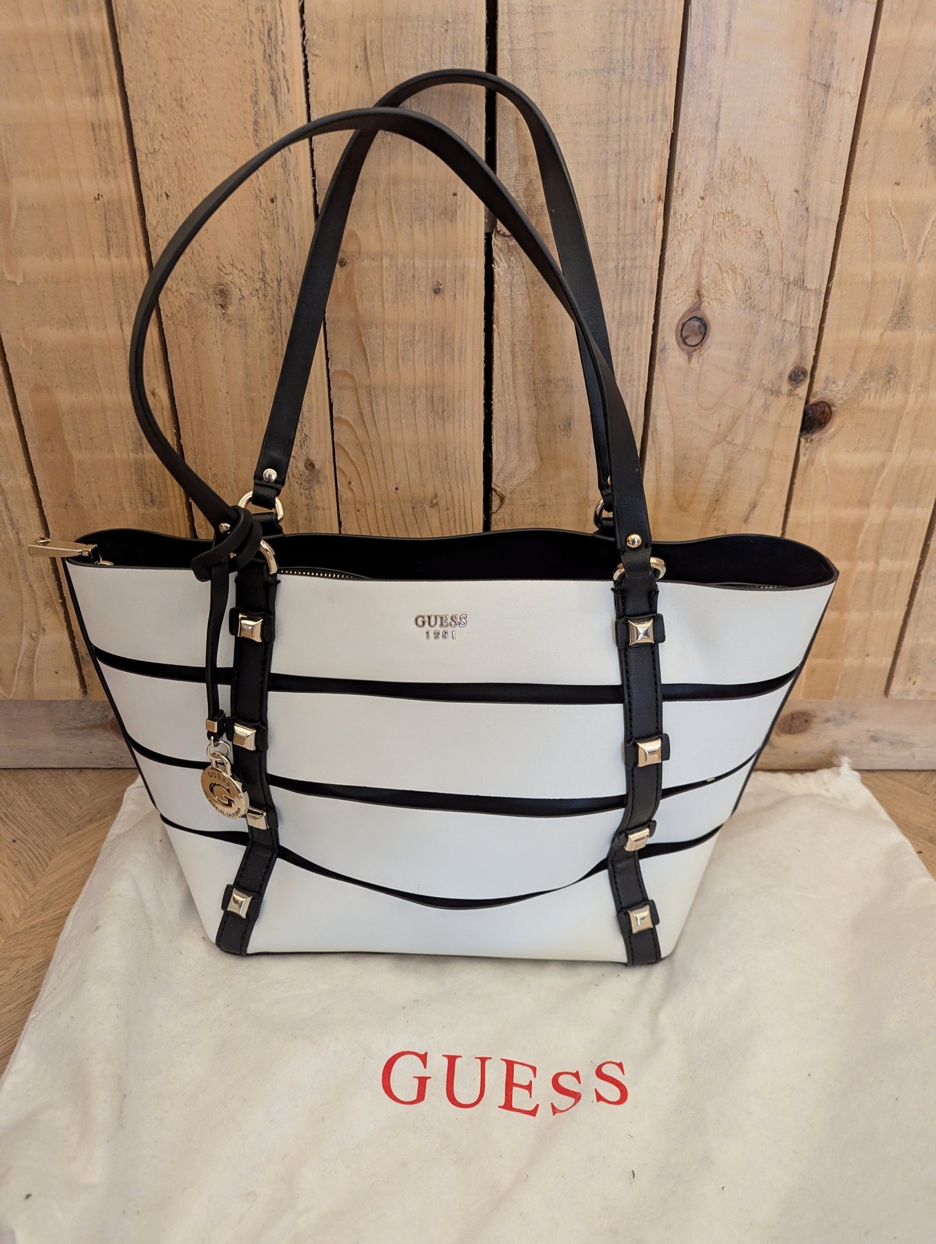 Condition: Excellent preloved condition, minimal signs of wear. Comes with original dust bag. This Guess tote is the perfect size for work or play. Studs and layered stripes give it a cool edge while there is plenty of room for your essentials within the zipped interior