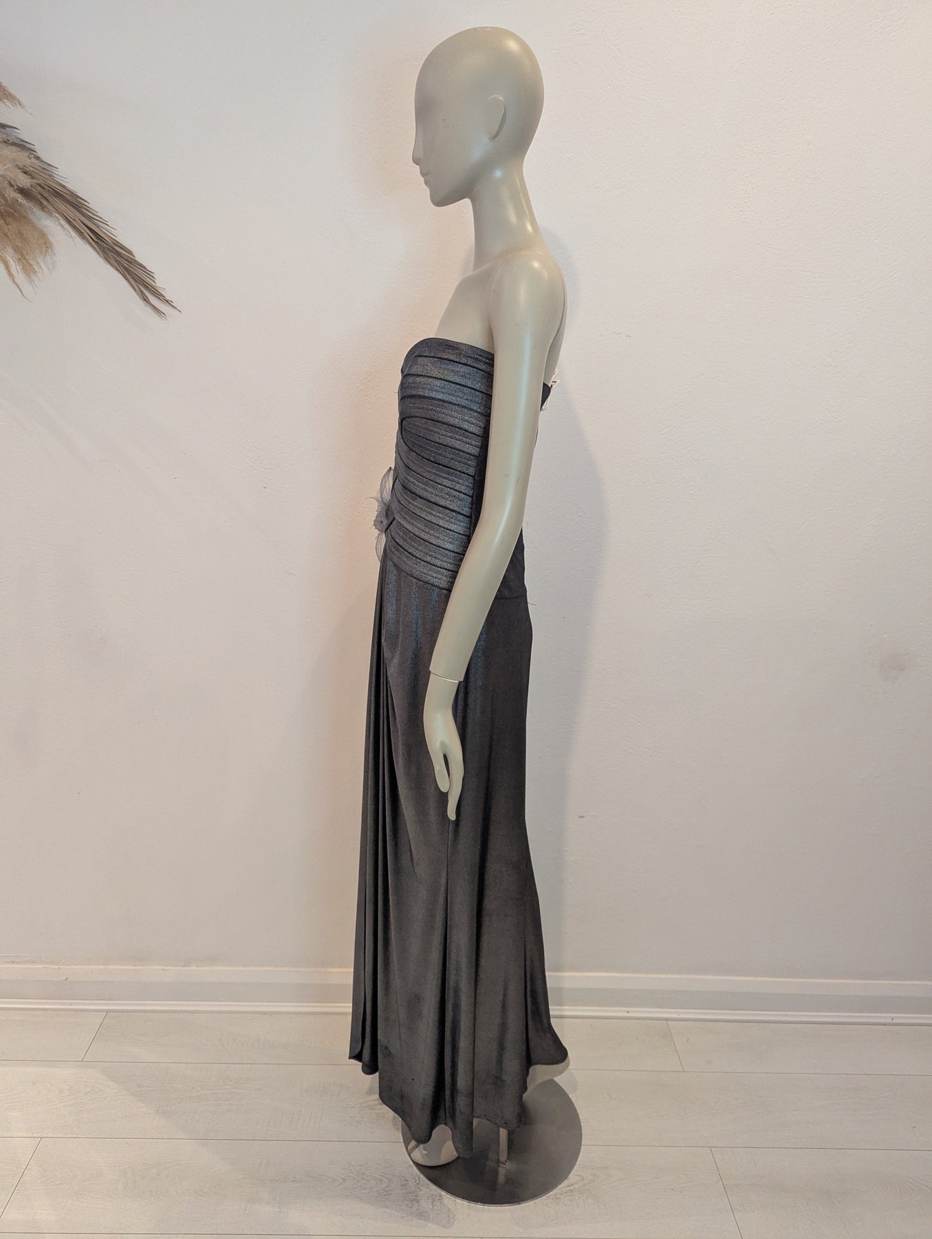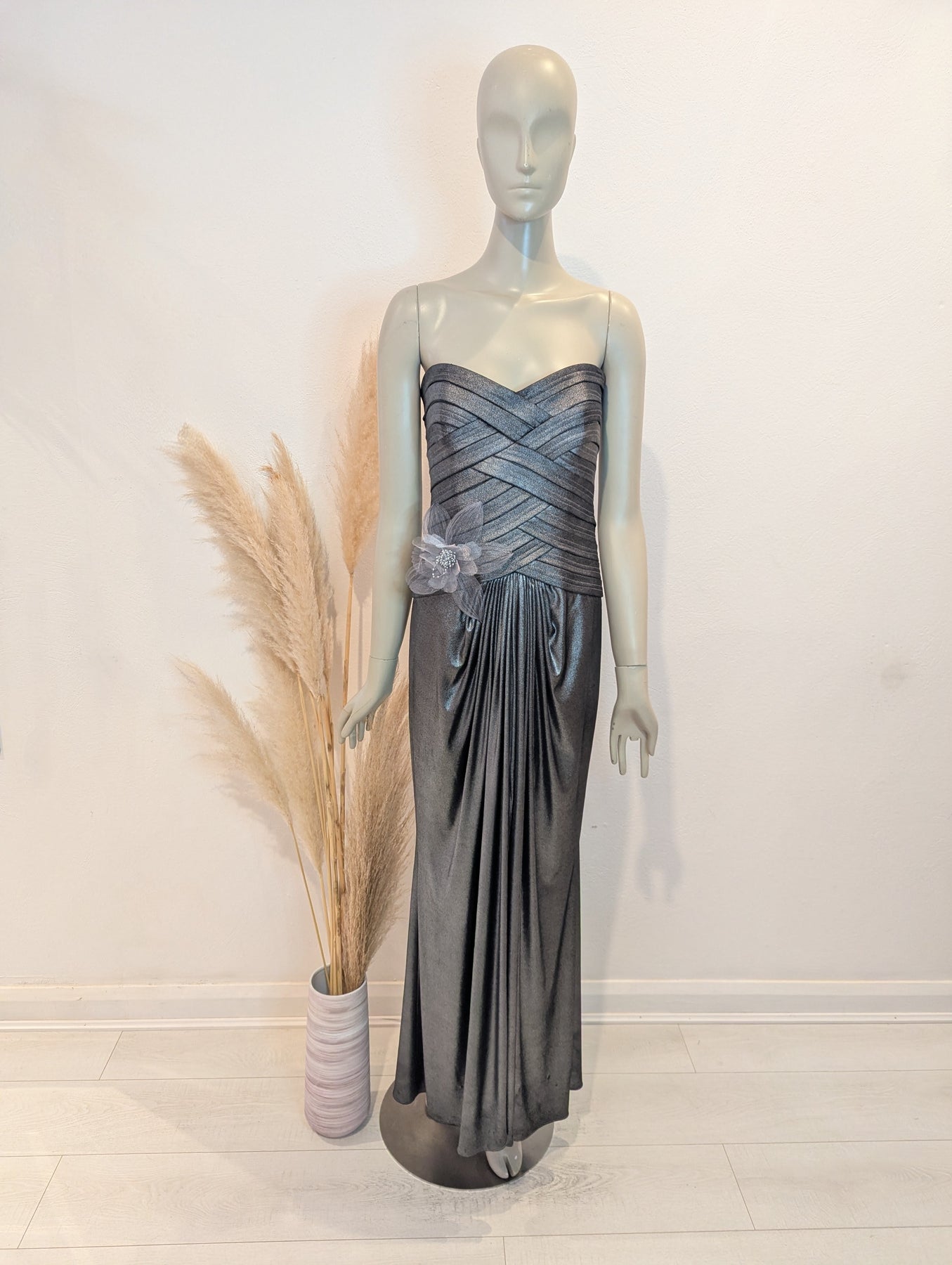 Condition: Excellent preloved condition no signs of wear. A vintage, strapless Joseph Ribkoff gown in a beautiful metallic grey. The bandage top section features a 3d flower. Zip back fastening