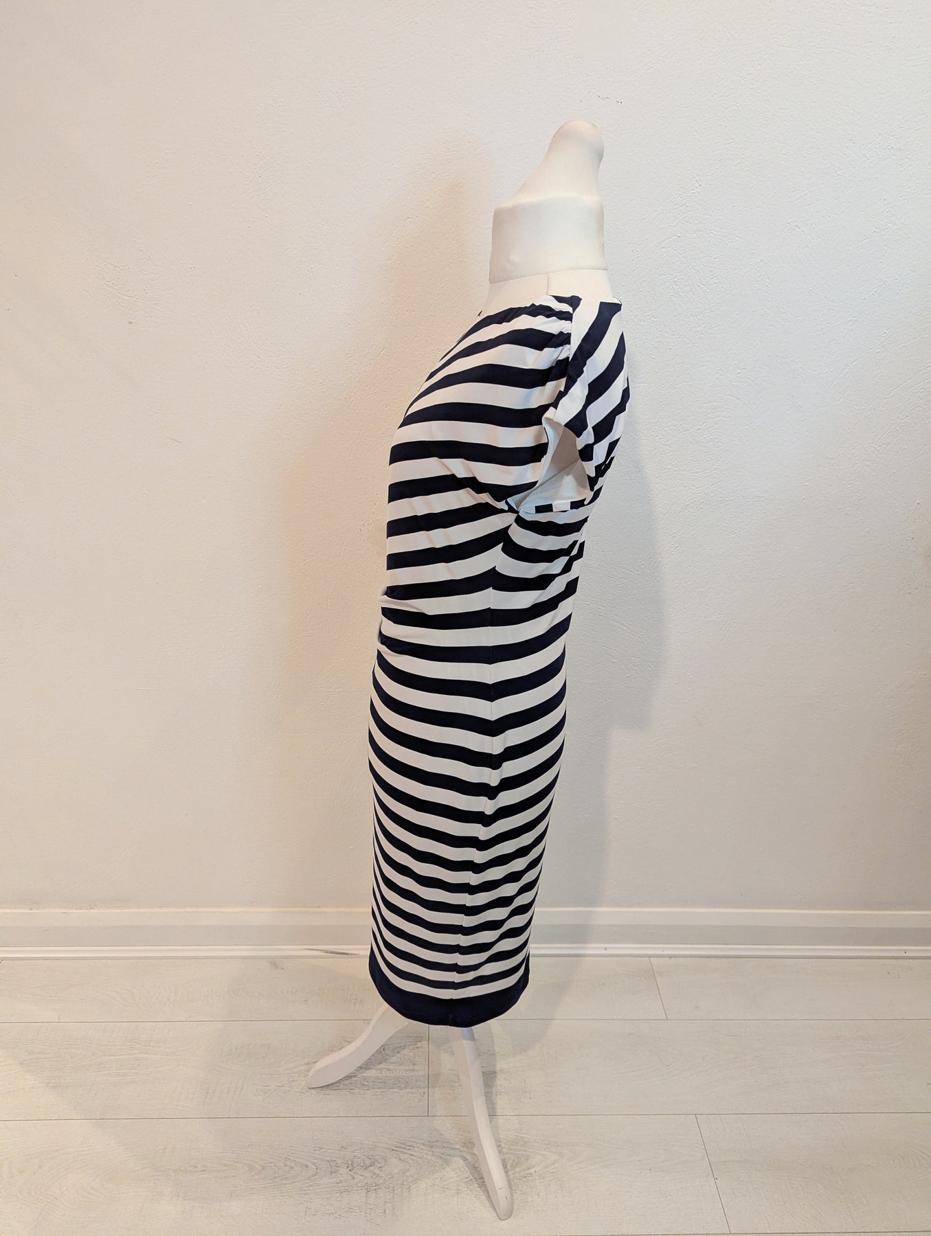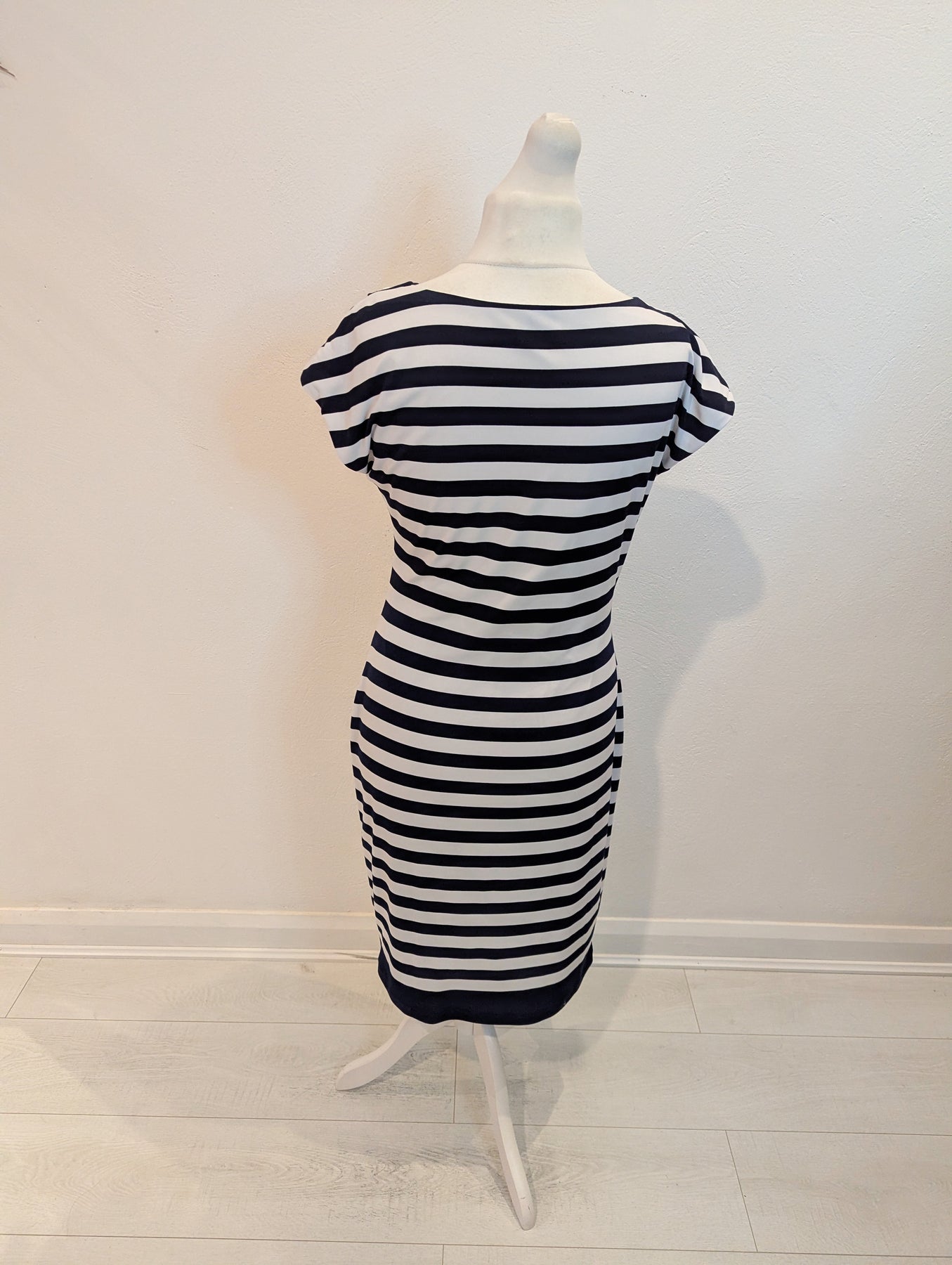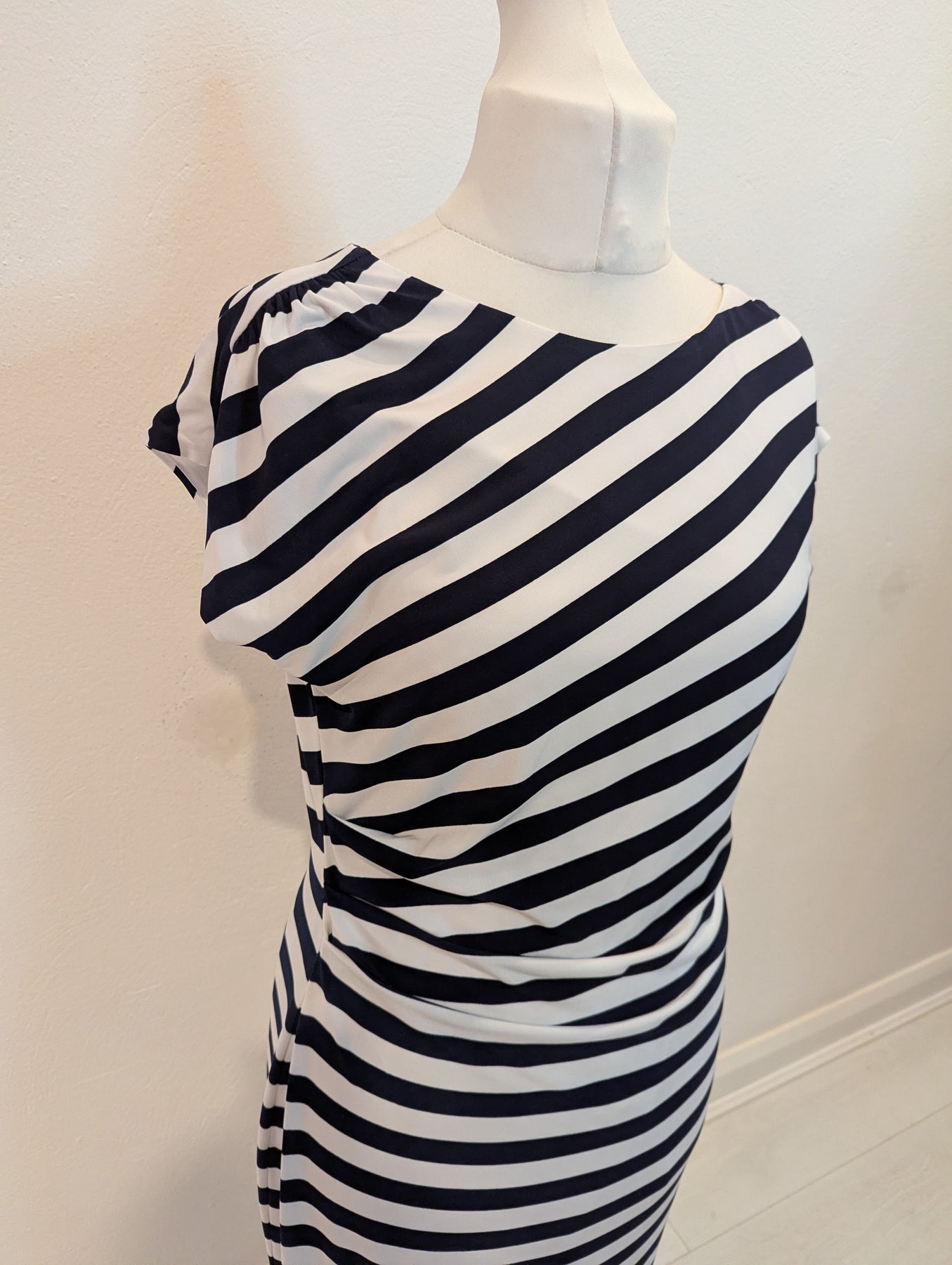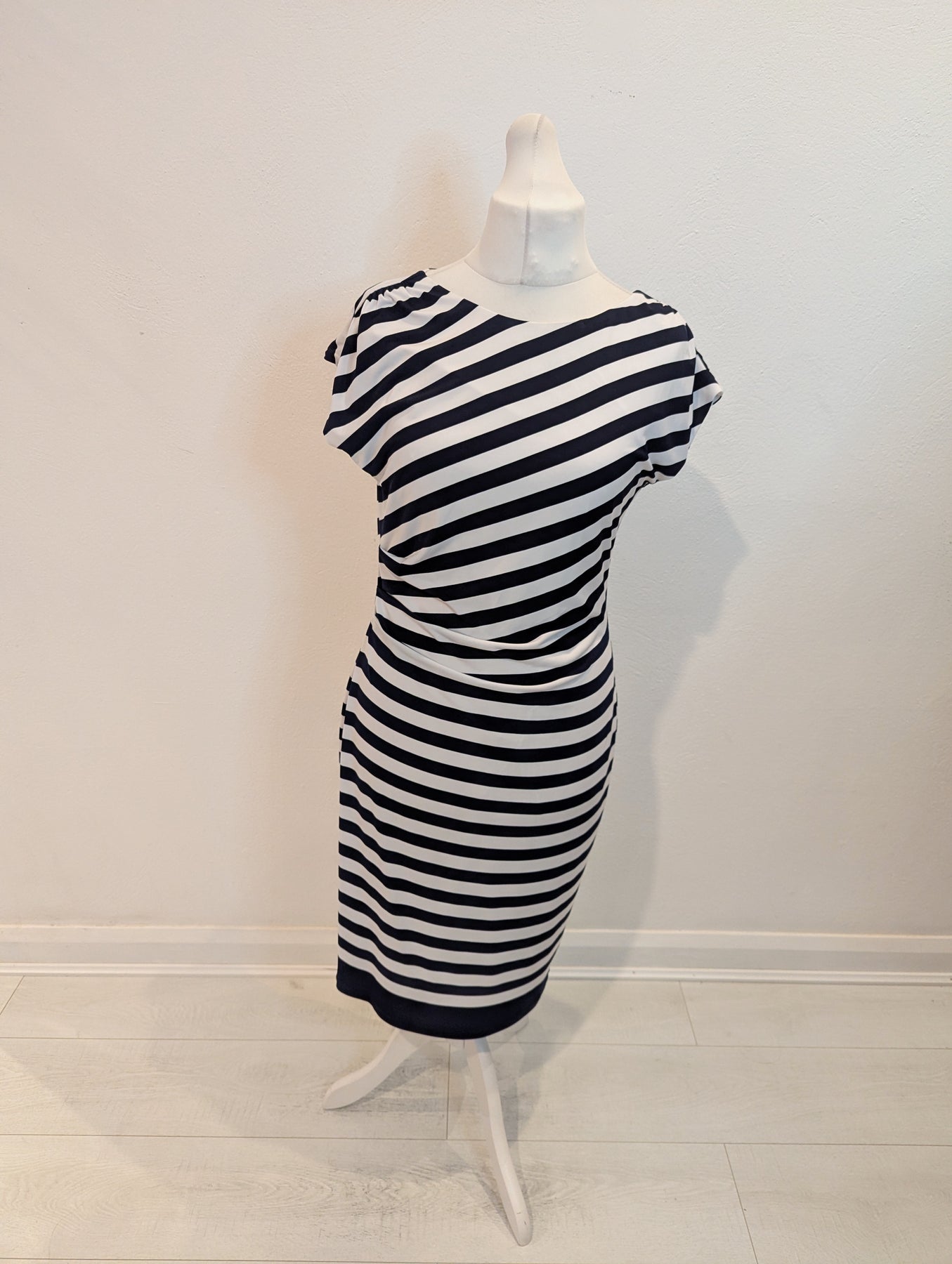 Condition: Excellent preloved condition no signs of wear. A flattering fit with ruching to the waist, slash neck, capped sleeves and stand out stripes