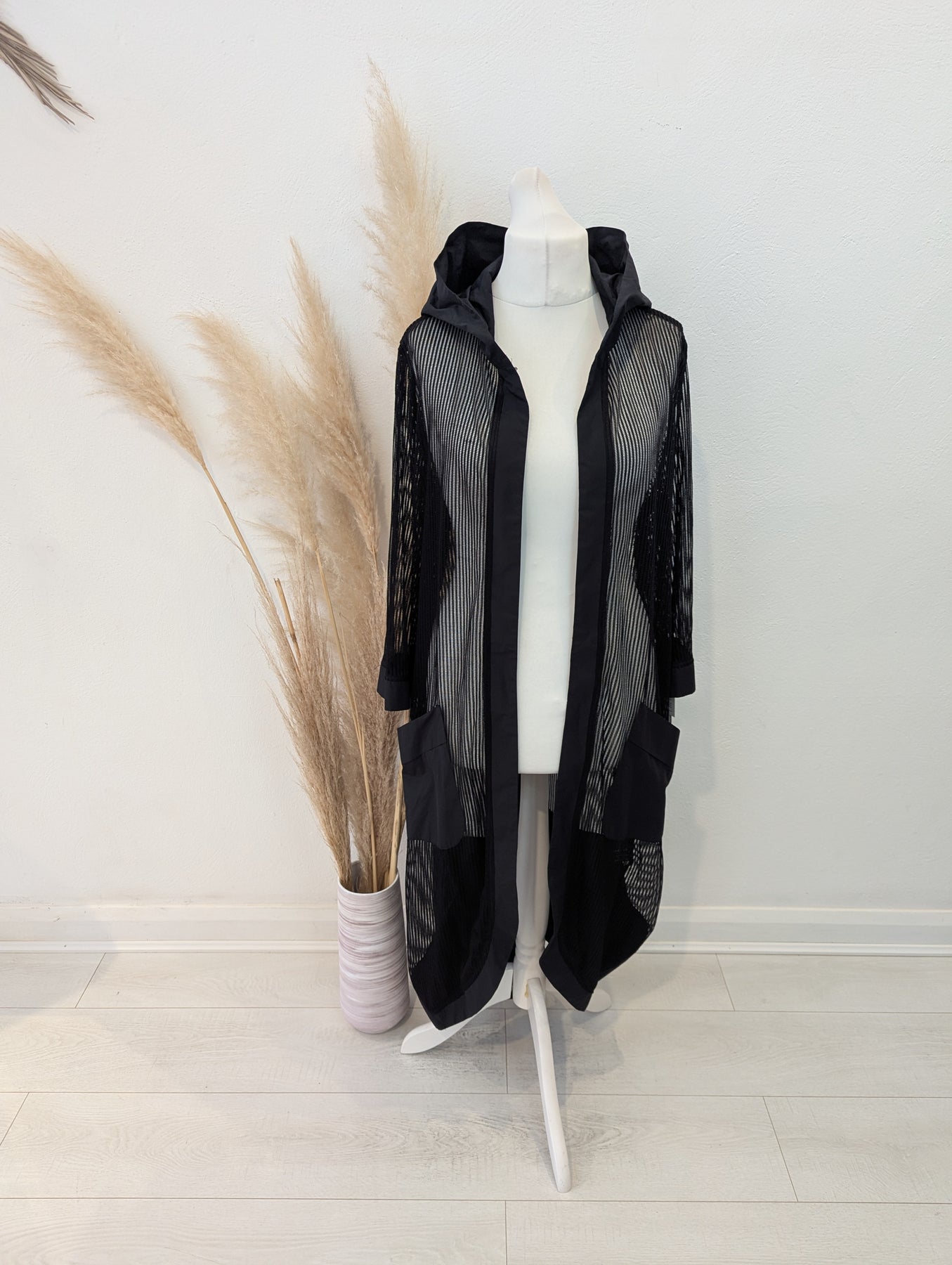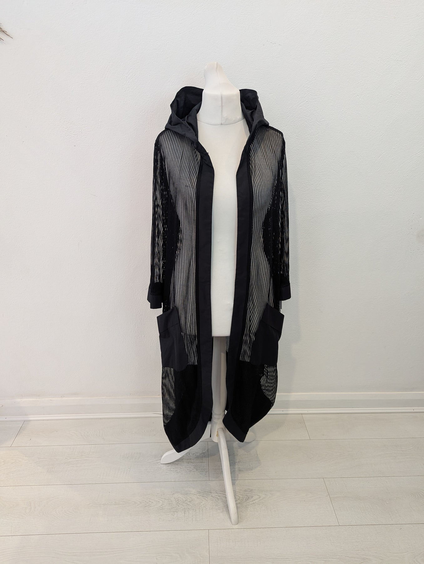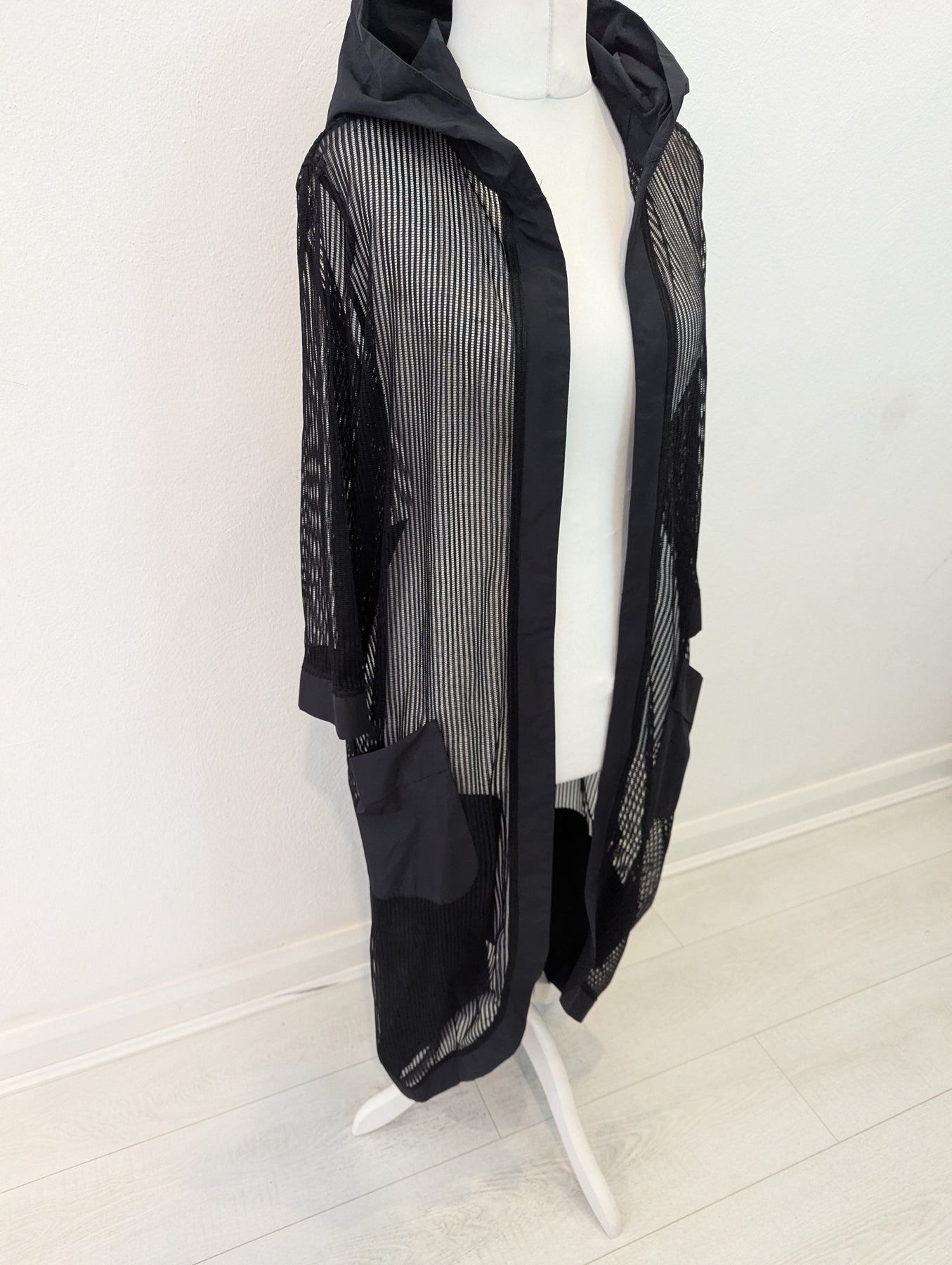 Condition: New with tags RRP £179. The versatility of mesh is showcased in this long line jacket from Naya. With contrast pockets and edge to edge trim, it’s a piece that will work in any wardrobe.