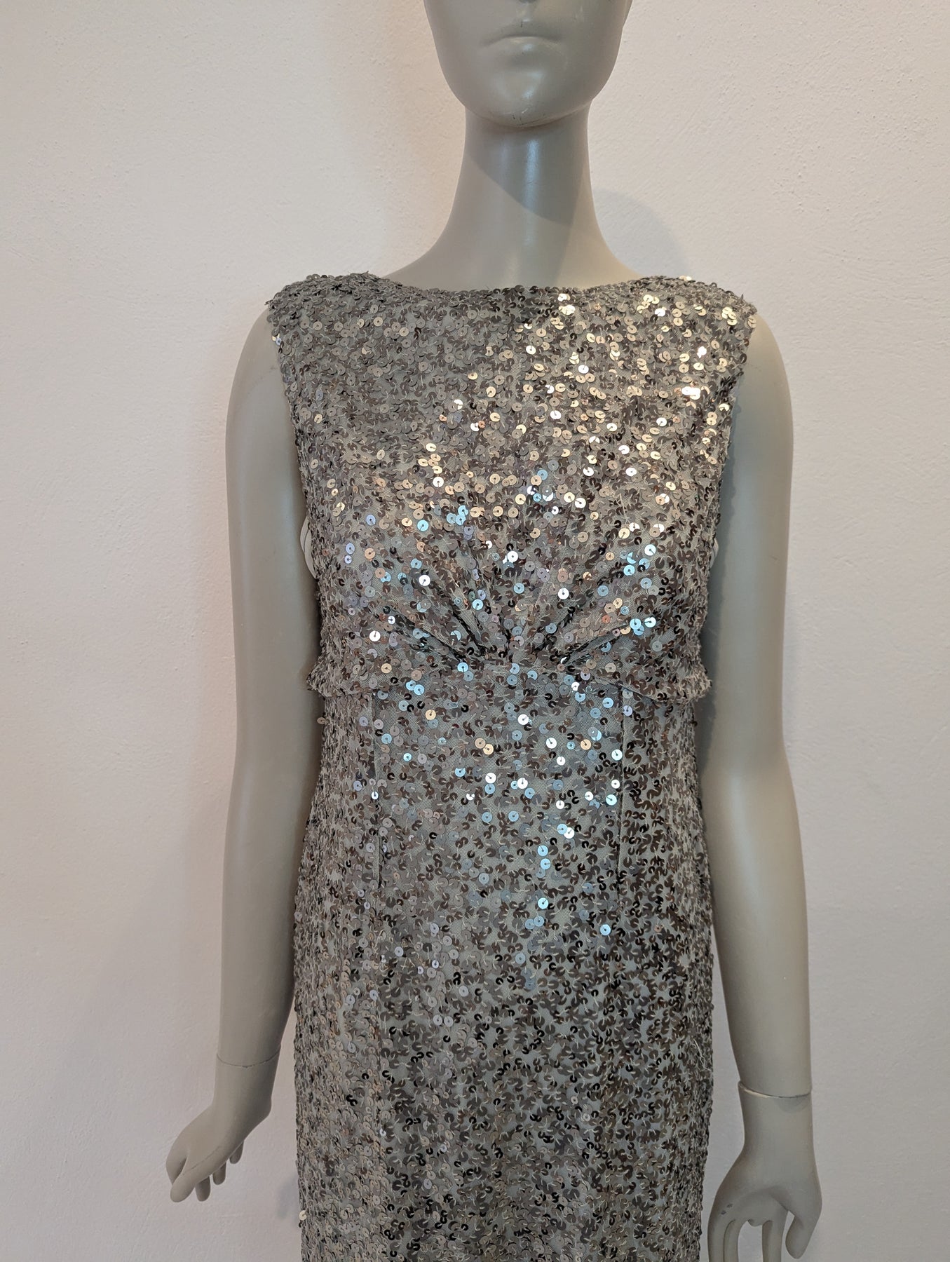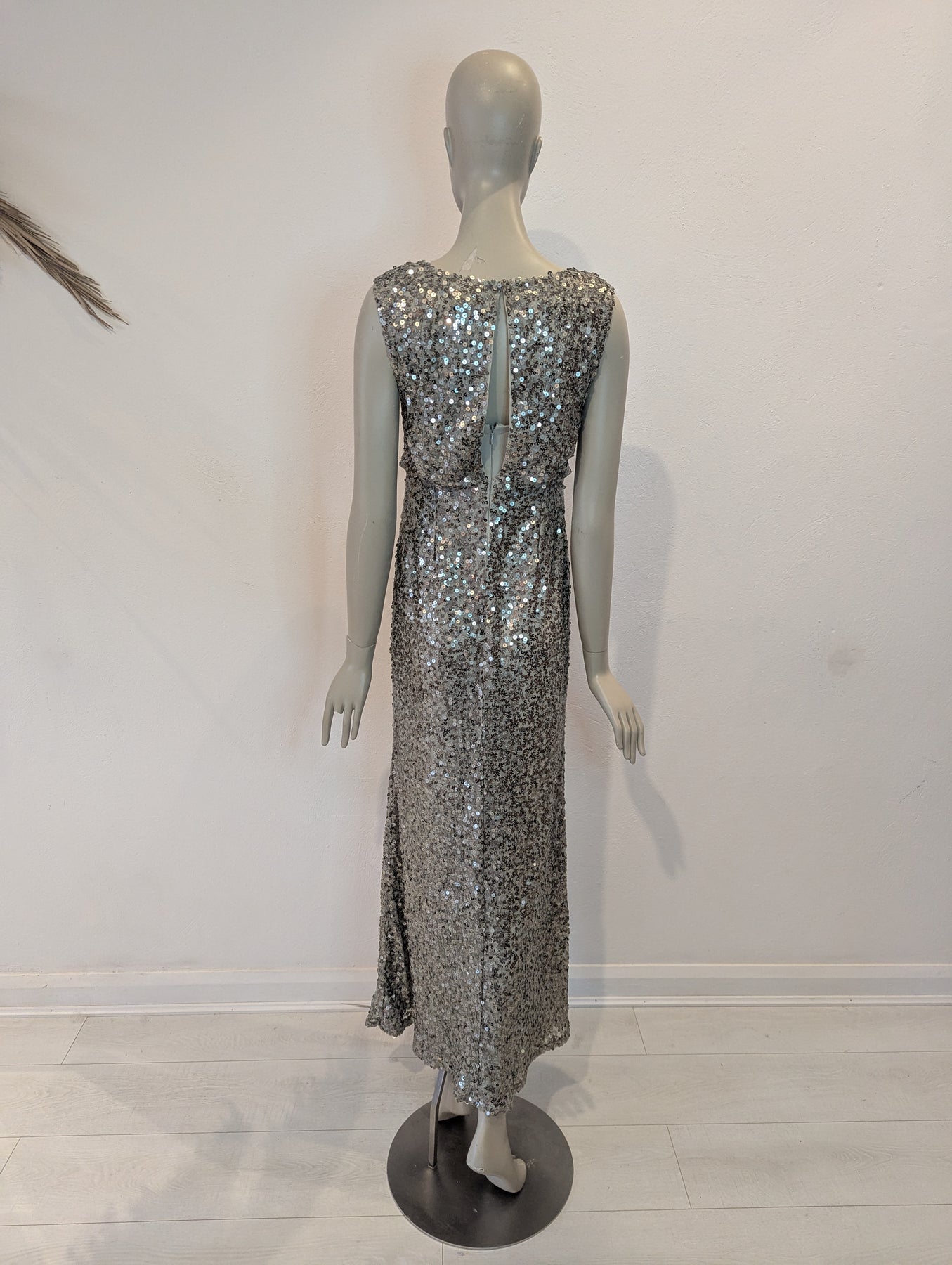 Condition: Excellent preloved condition no signs of wear. Stunning No1 Jenny Packham Carrie silver sequinned evening gown, the dress consists of an attached slip, over that is the sequin covered mesh dress. Fastening in the back with a concealed zipper and a hook and eye feature. Perfect for awards season